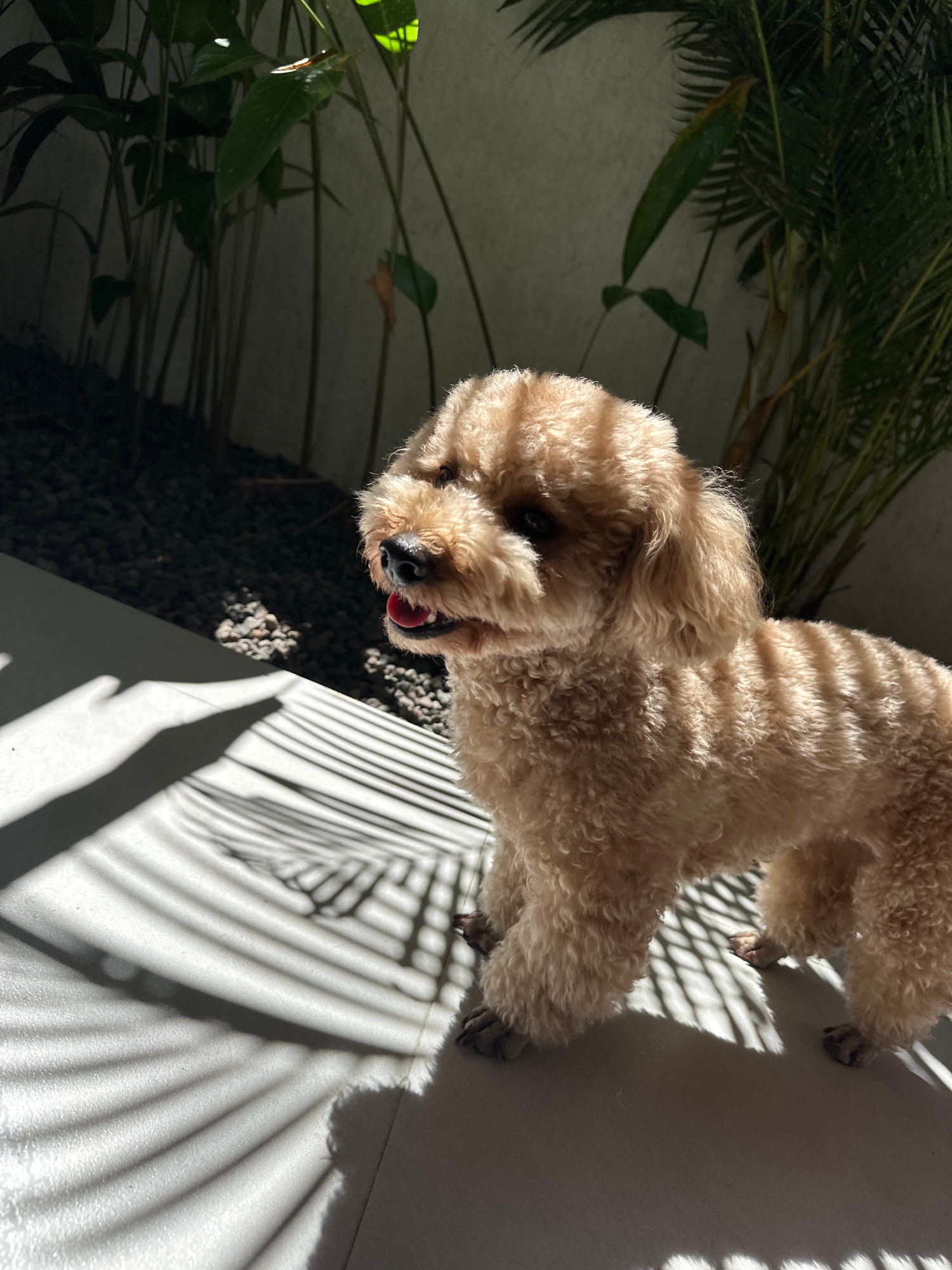 A brown poodle stands indoors on a light-colored tile floor, partially illuminated by sunlight filtering through foliage. The shadows of palm leaves and other plants cast geometric stripes across theβ¦read more