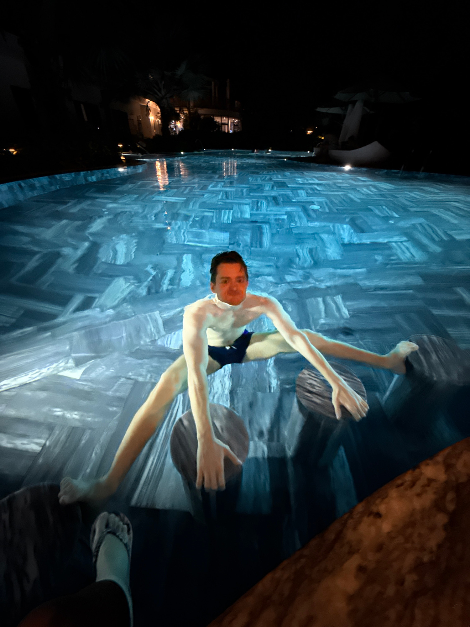 The image depicts a nighttime scene in a swimming pool, likely at a resort in Phú Quốc, Vietnam. The central subject is a male figure, partially submerged in the blue-grey water. His face, which appea…read more
