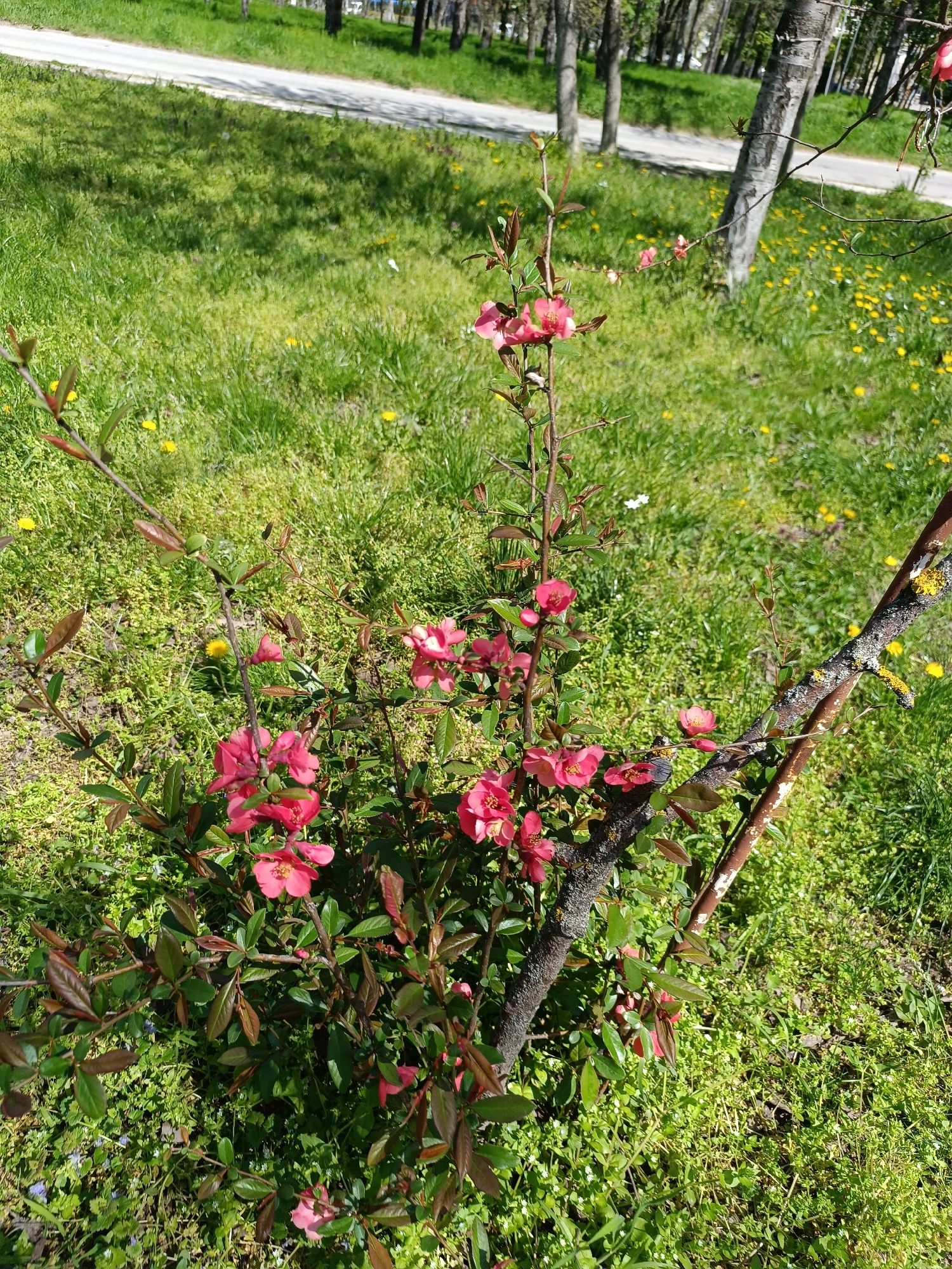 This image captures a vibrant outdoor scene, likely a park or natural area, under bright sunlight. In the foreground, a prominent flowering shrub with numerous pinkish-red blossoms and green-brown lea…read more