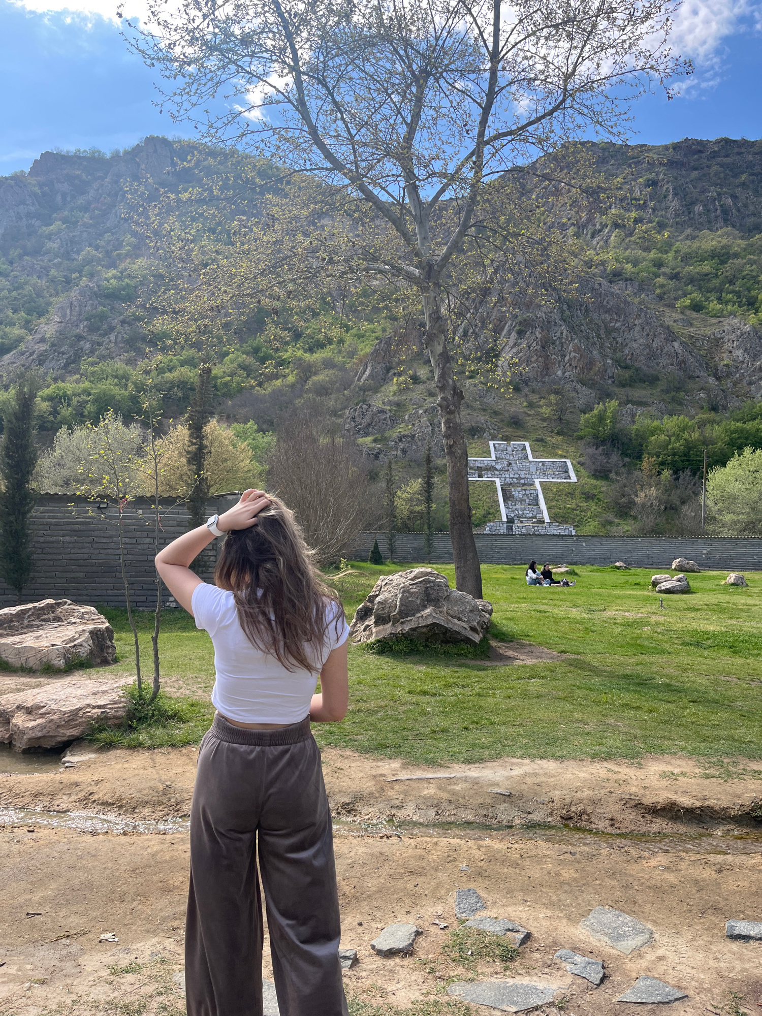 A young woman with long brown hair, wearing a white t-shirt and brown pants, stands on a dirt path in General Todorov, Bulgaria. She has her right hand on her head, seeming to adjust her hair. In the…read more