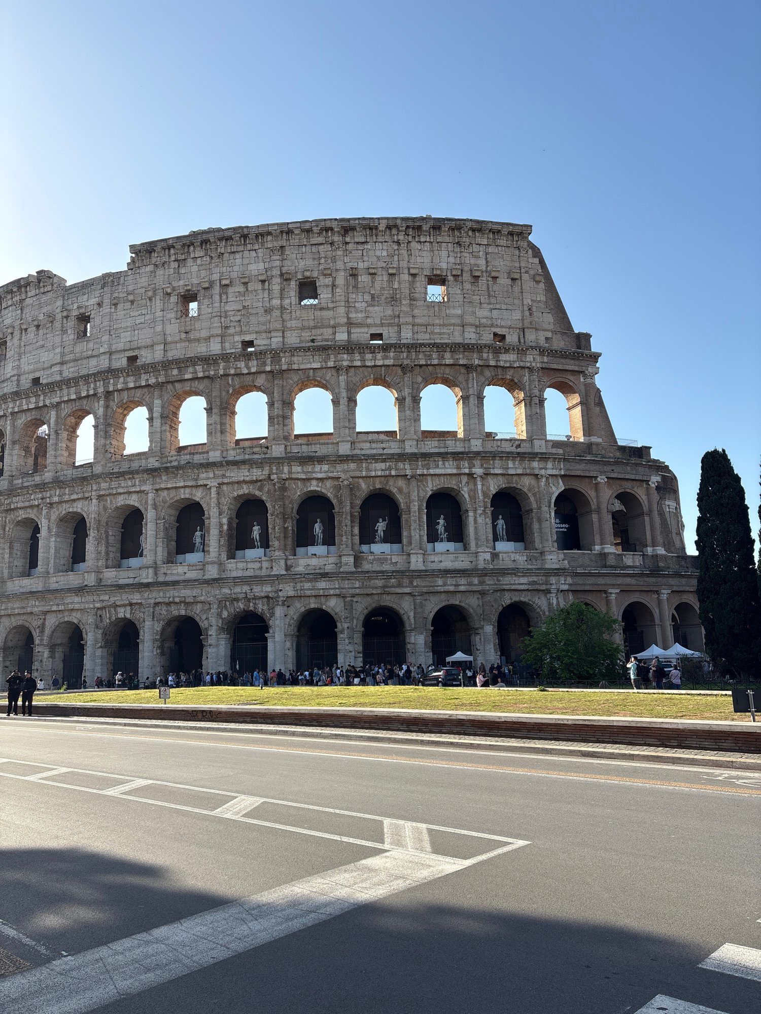 The image displays a rotated, portrait-oriented view of the Colosseum in Rome, Italy, under a clear, bright blue sky. The iconic ancient Roman amphitheater, constructed from stone, occupies the lower…read more