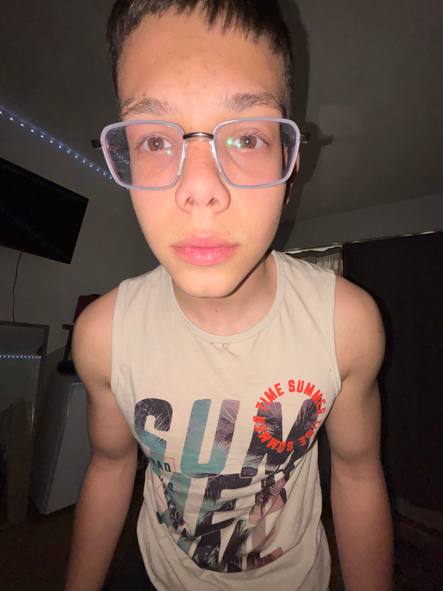 This rotated close-up portrait features a young individual, likely male, with short dark hair and light skin, wearing modern transparent-framed glasses. They have brown eyes and a neutral, direct gaze…read more