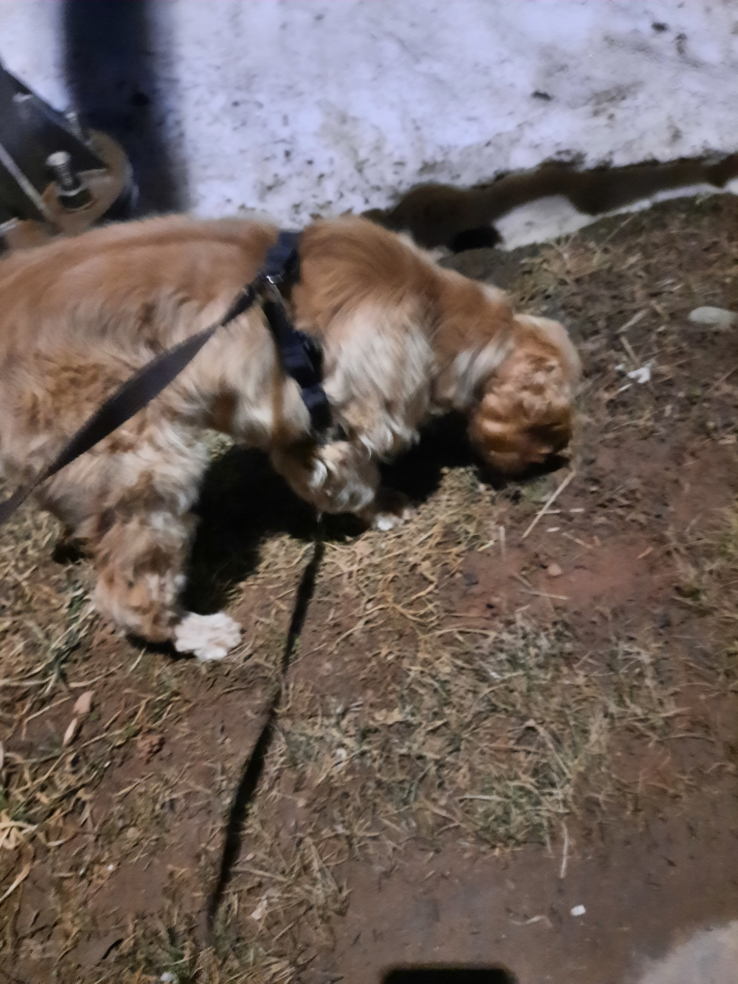 A medium-sized, light-brown dog is lying on the ground partially covered with dry grass. The dog is wearing a dark harness and a leash is attached. To the left, there is snow and what appears to be pa…read more