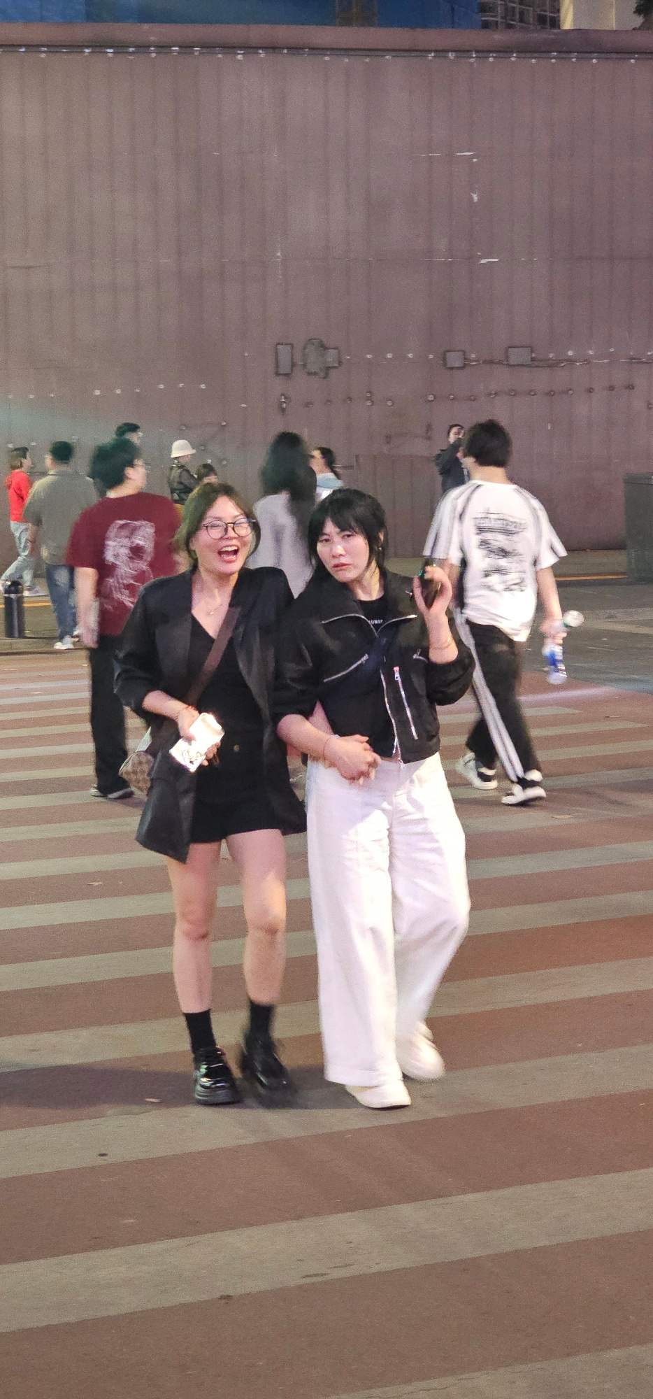 The image captures a street scene in Yuzhong District, China. The foreground features two women standing close to each other, apparently posing for a photo. The woman on the left is smiling broadly wi…read more