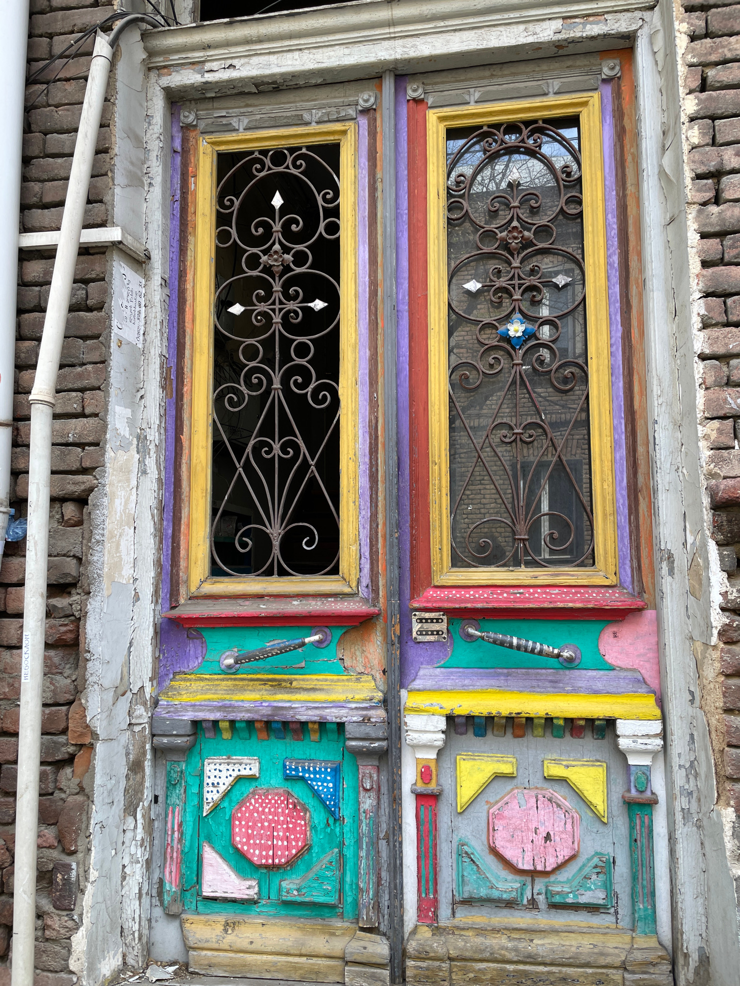This is a close-up, brightly lit, and slightly angled shot of a colorful, old, and intricately decorated window or door in Tbilisi, Georgia. The primary subject is the ornate window/door, which is co…read more