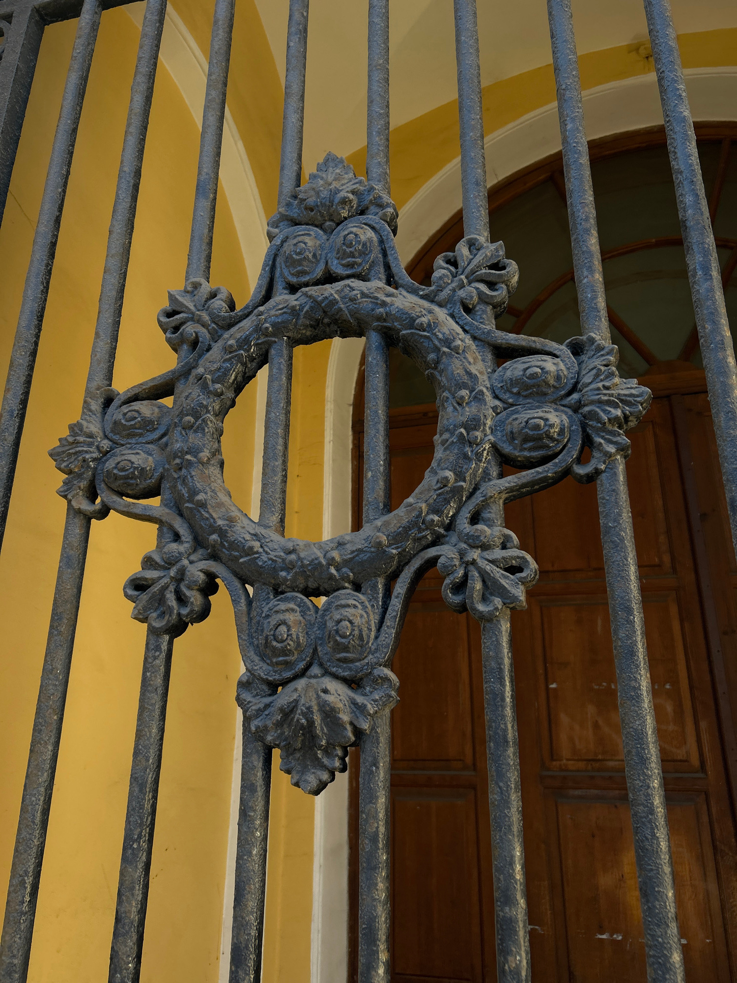 The image displays a close-up view of an ornate, dark metal grate or railing. At its center is a decorative medallion, likely cast iron, fashioned into a circular, wreath-like shape adorned with symmeβ¦read more