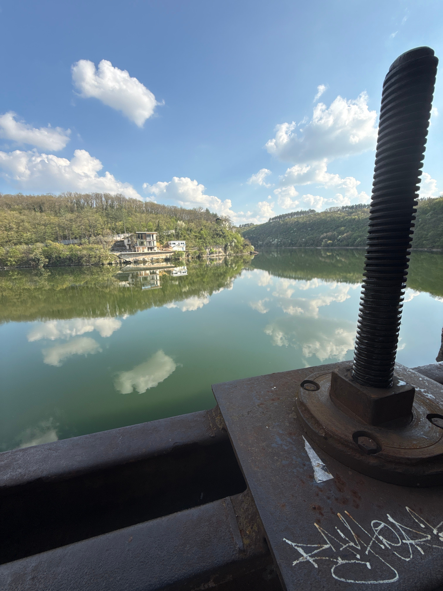 The image displays a bright, sunny landscape centered around a body of water, viewed from what appears to be a large industrial structure, likely a dam or reservoir facility, in Pleven, Bulgaria. In…read more