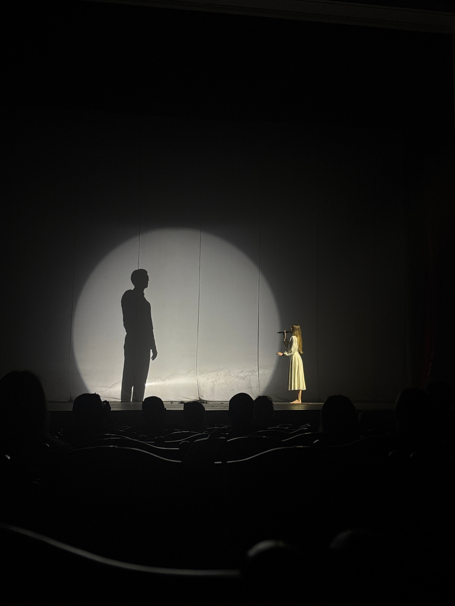 The image depicts a scene from a theatrical performance. A woman in a light-colored dress stands under a spotlight, holding a microphone. The shadow of a man is cast on the backdrop of the stage, posi…read more