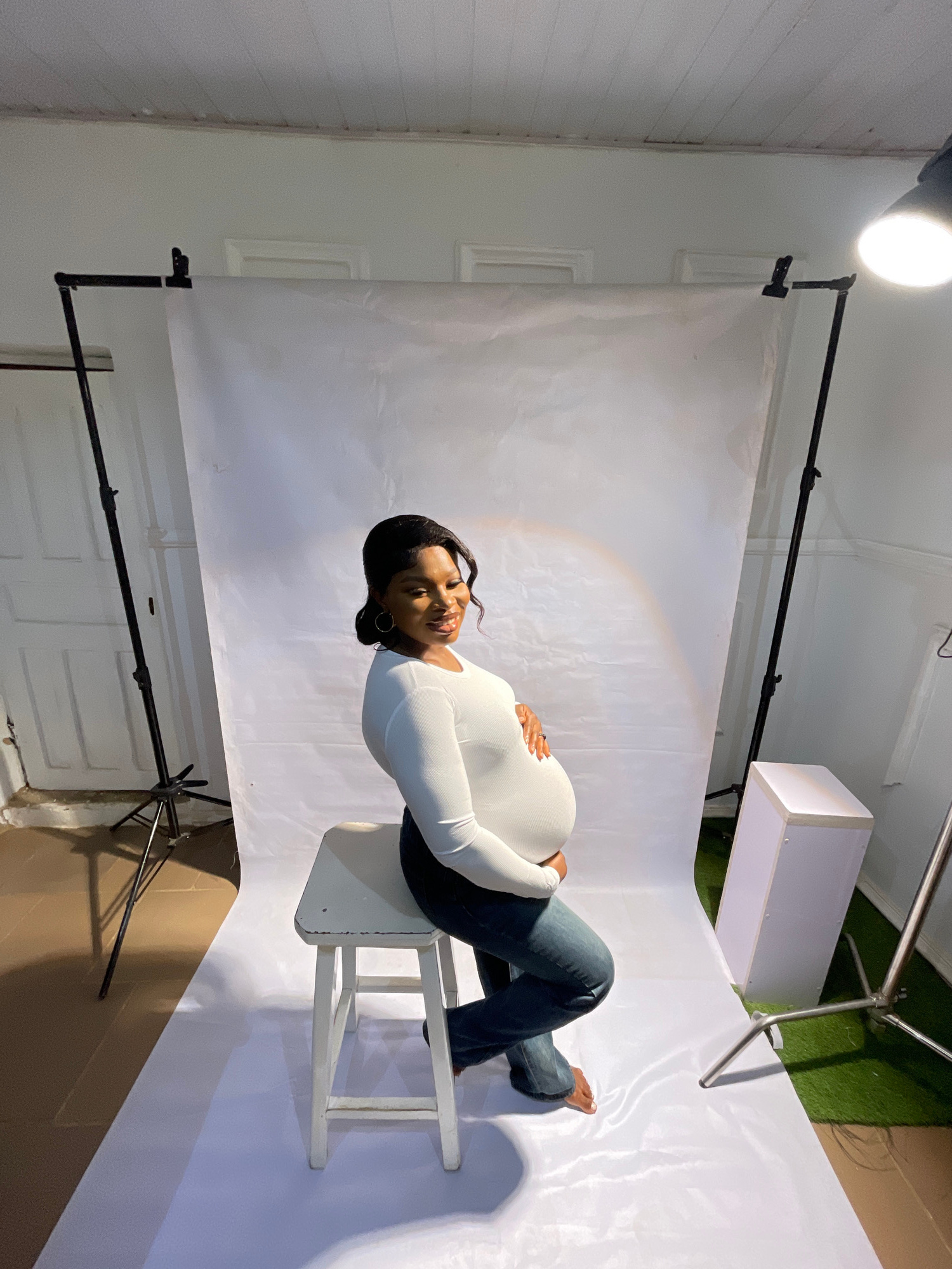 A woman is lying on her left side on a white wooden chair, facing the camera. She is positioned in a studio setting with a white backdrop and lighting equipment. She wears a long-sleeved white shirt a…read more