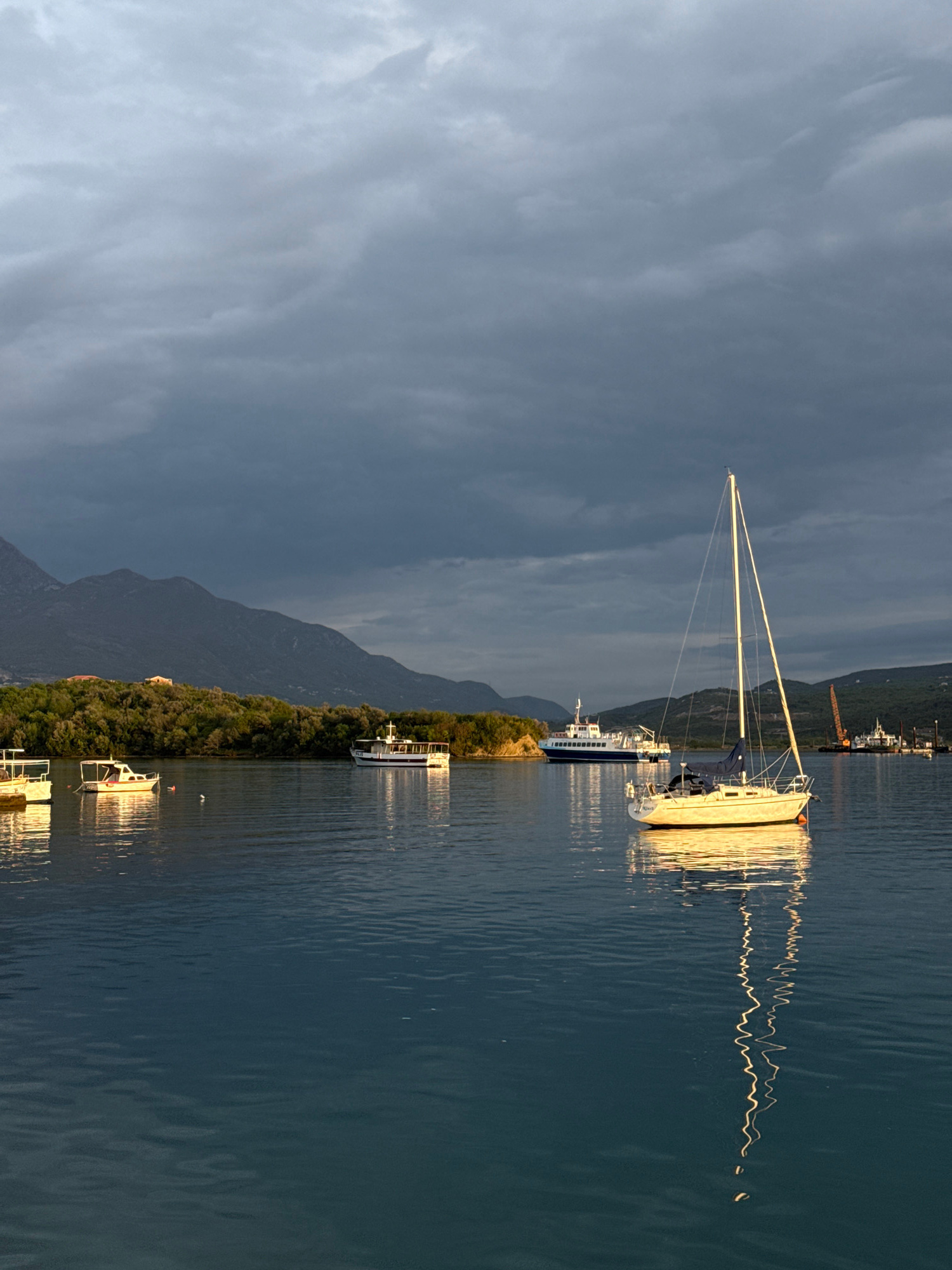 A landscape oriented photograph depicts boats in a body of water, potentially a harbor or bay, under a dramatic sky. The image is most likely taken in Bogišići, Montenegro, given the setting. The main…read more
