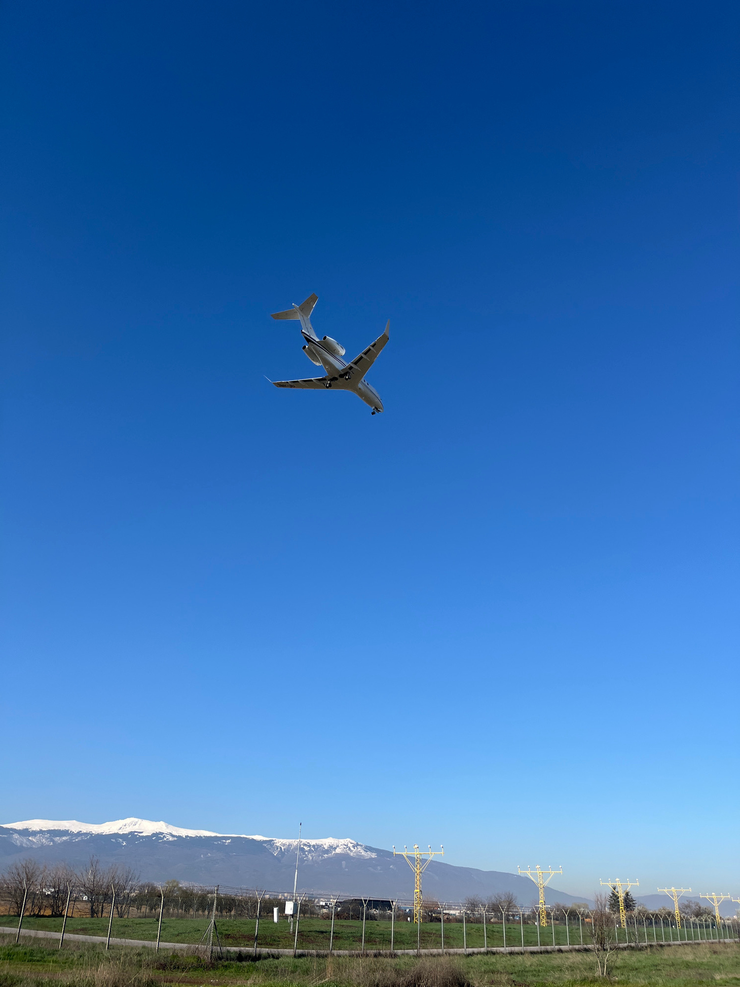 A low-angle shot captures a white aircraft in flight against a bright blue sky. On the right side of the image, there's a landscape featuring mountains with visible snow on the peaks, and a grassy are…read more