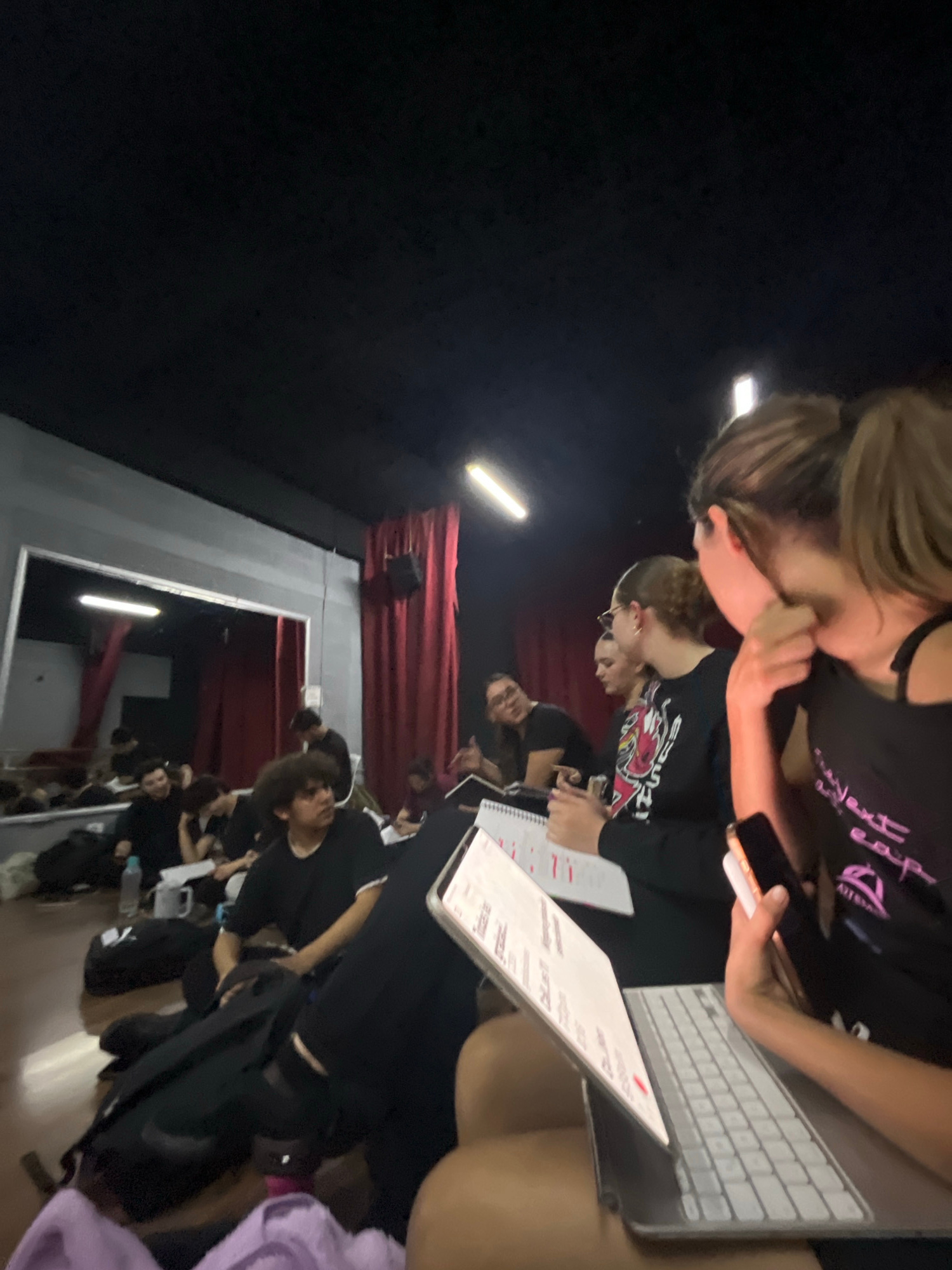 The image shows a group of people in what appears to be a dance studio or performance space in San Bernardino Tlaxcalancingo, Mexico. Red curtains are visible in the background. The people are mostly…read more