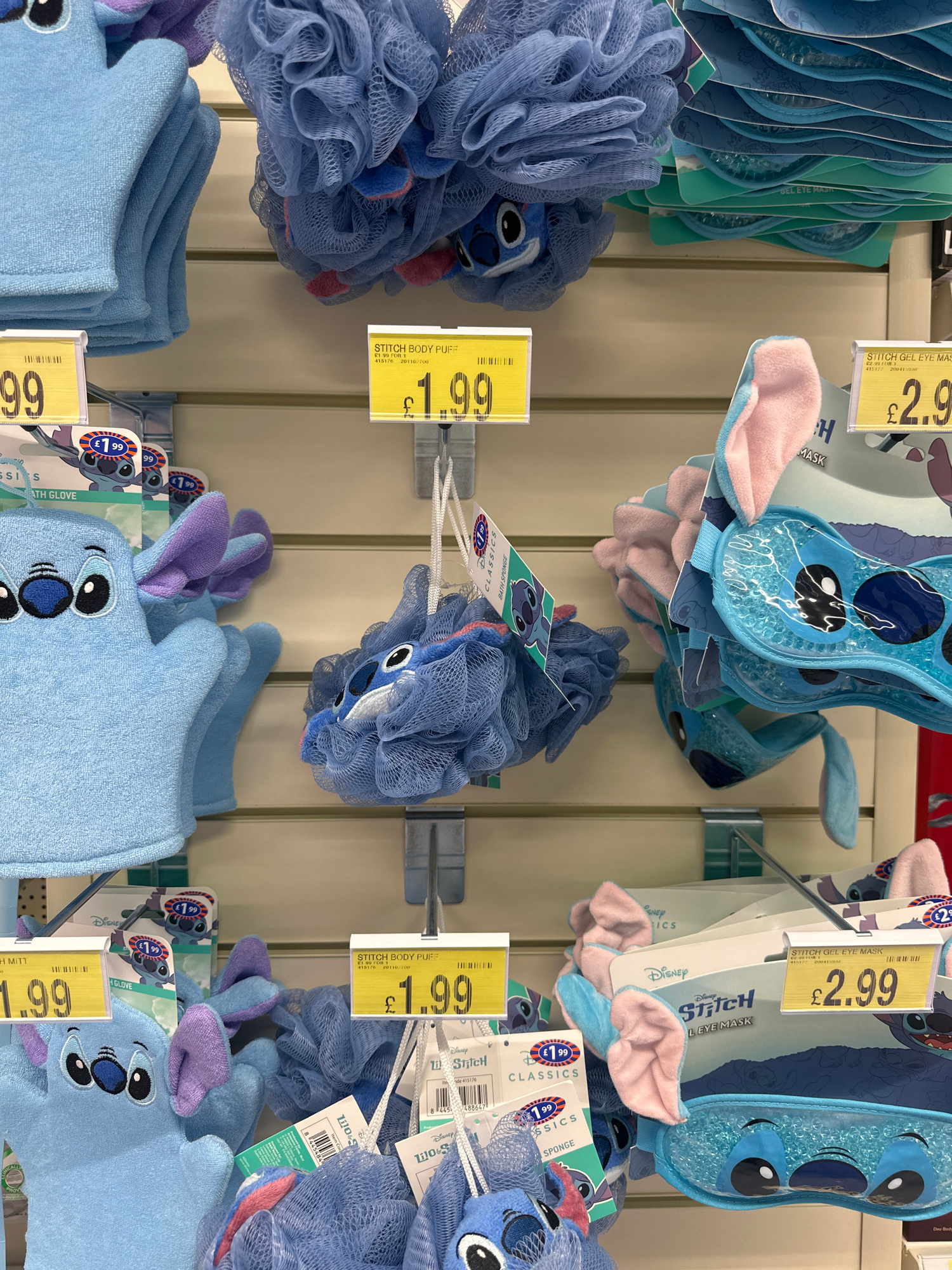 The image shows a display of Disney-themed bath and beauty products, specifically Stitch-branded items, arranged on shelves. The products include gel eye masks, bath gloves, and body puffs. Price tags…read more
