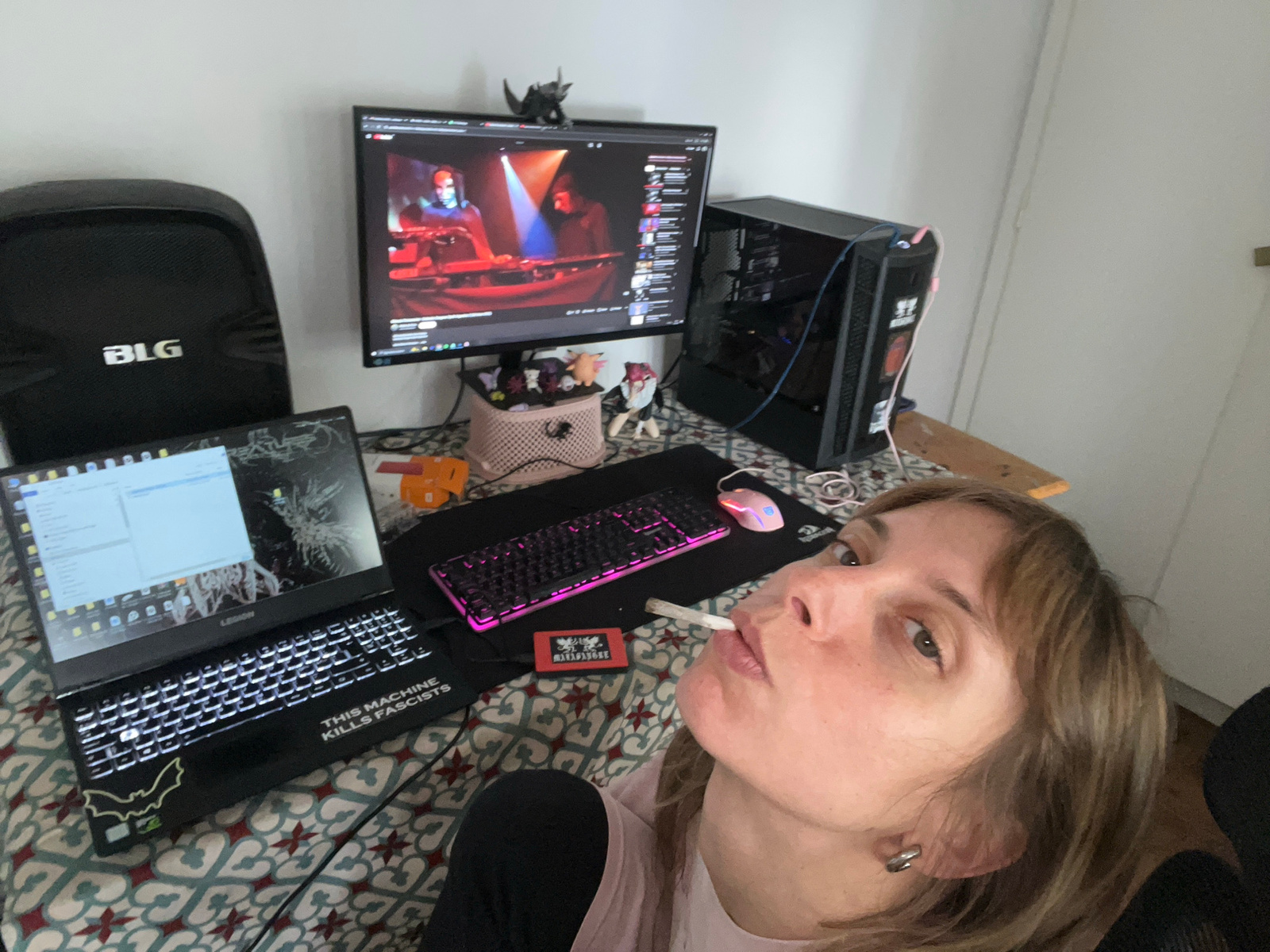 A person is seen in a selfie, holding a cigarette in their mouth. They are indoors, apparently in their bedroom or a similar private space. The room is decorated with a patterned bedspread. In the bac…read more