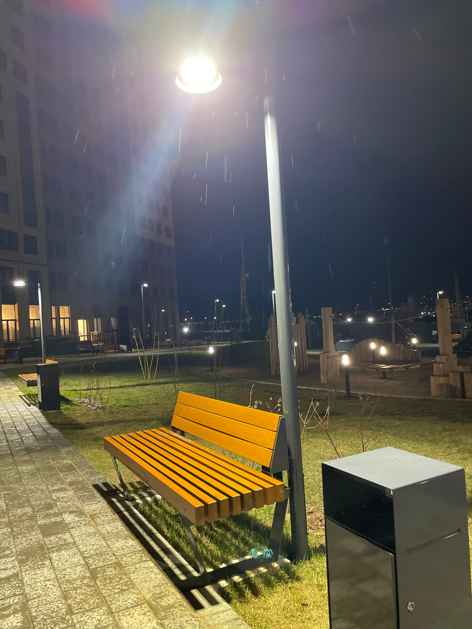 The image depicts a night scene in Izhevsk, Russia. It is snowing lightly. A yellow wooden bench sits on a green lawn next to a gray brick walkway. A modern black trash receptacle is situated near the…read more