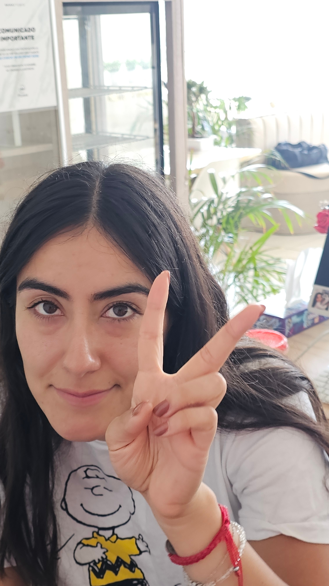 A young woman is in an indoor environment, posing for a selfie while making a peace sign with her right hand. She is wearing a white T-shirt with a cartoon character print. She has long, dark hair andβ¦read more