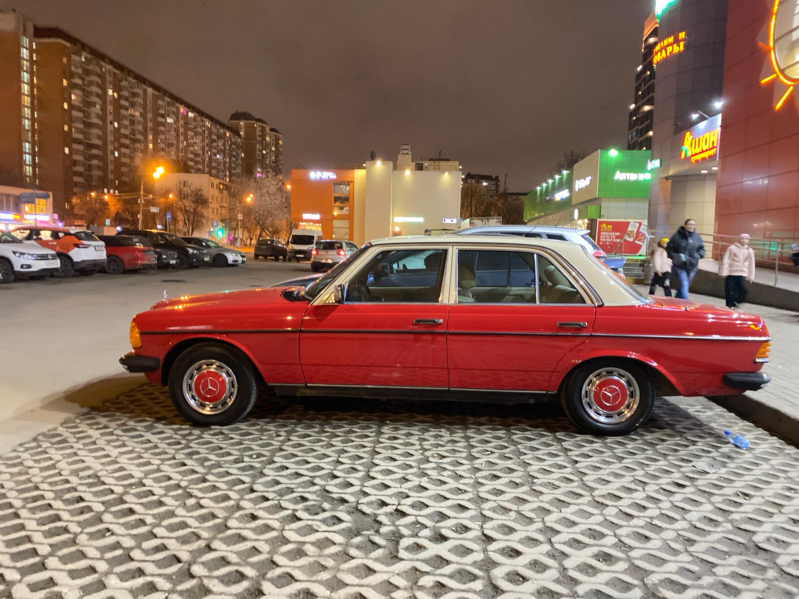 The image depicts a red and white vintage Mercedes-Benz sedan parked on a paved area with a patterned surface. In the background, there's a cityscape at night, including a tall building with "Ашан" (A…read more