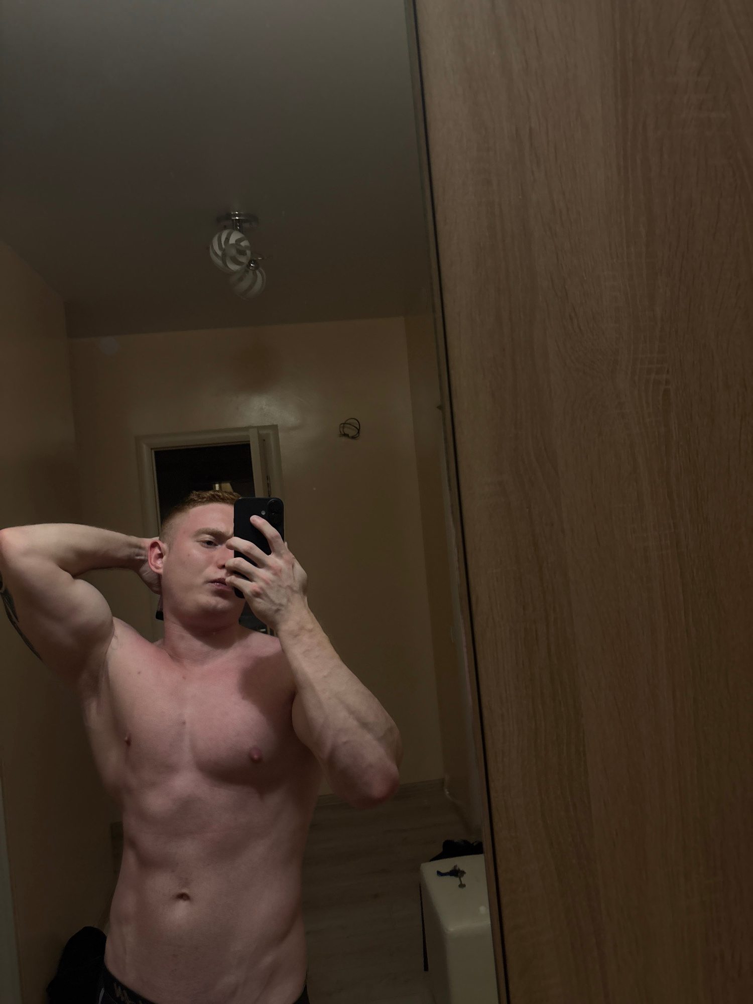 A shirtless, light-skinned male stands in a bathroom with light-colored walls and a light wood-toned ceiling, taking a selfie in a mirror. He is holding a black smartphone in his right hand, obscuring…read more