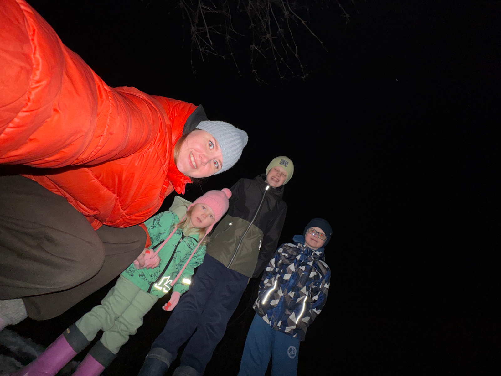 A low-angle shot taken at night shows five individuals outdoors. The person closest to the camera is wearing a grey knitted hat and a bright orange puffer jacket, looking upwards with a smile. Behind…read more