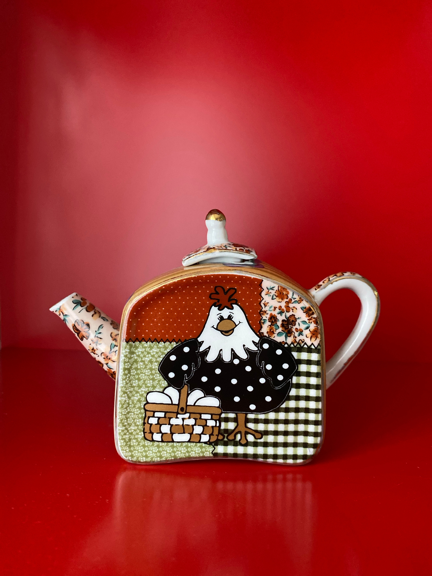 The image shows a ceramic teapot with a decorative design featuring a chicken motif. The teapot has a square body, a handle, and a spout. The design on the teapot incorporates various patterns, includ…read more