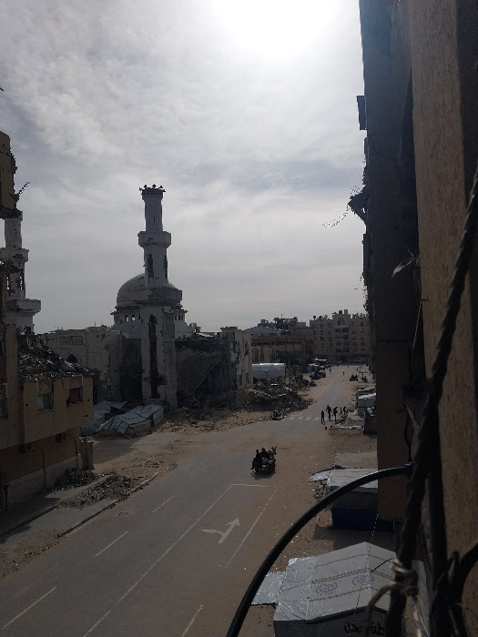 The image displays an urban scene characterized by significant destruction and debris, viewed from an elevated perspective, possibly from a damaged building. The photograph is oriented vertically, app…read more