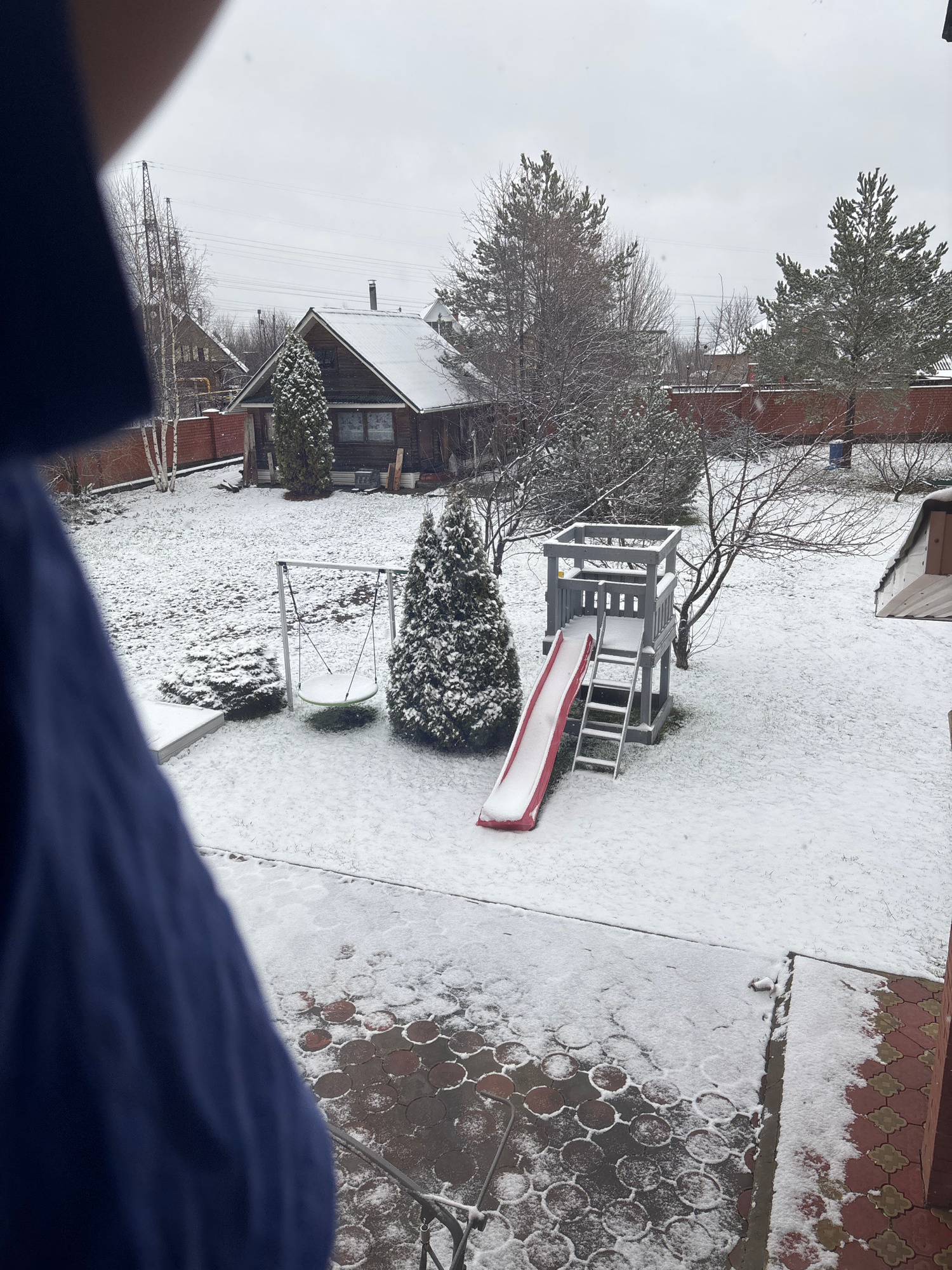 The image depicts a snow-covered backyard in Ферма, Russia. A wooden house with a gable roof is visible, along with a children's play structure that includes a slide. Other objects include a swing set…read more