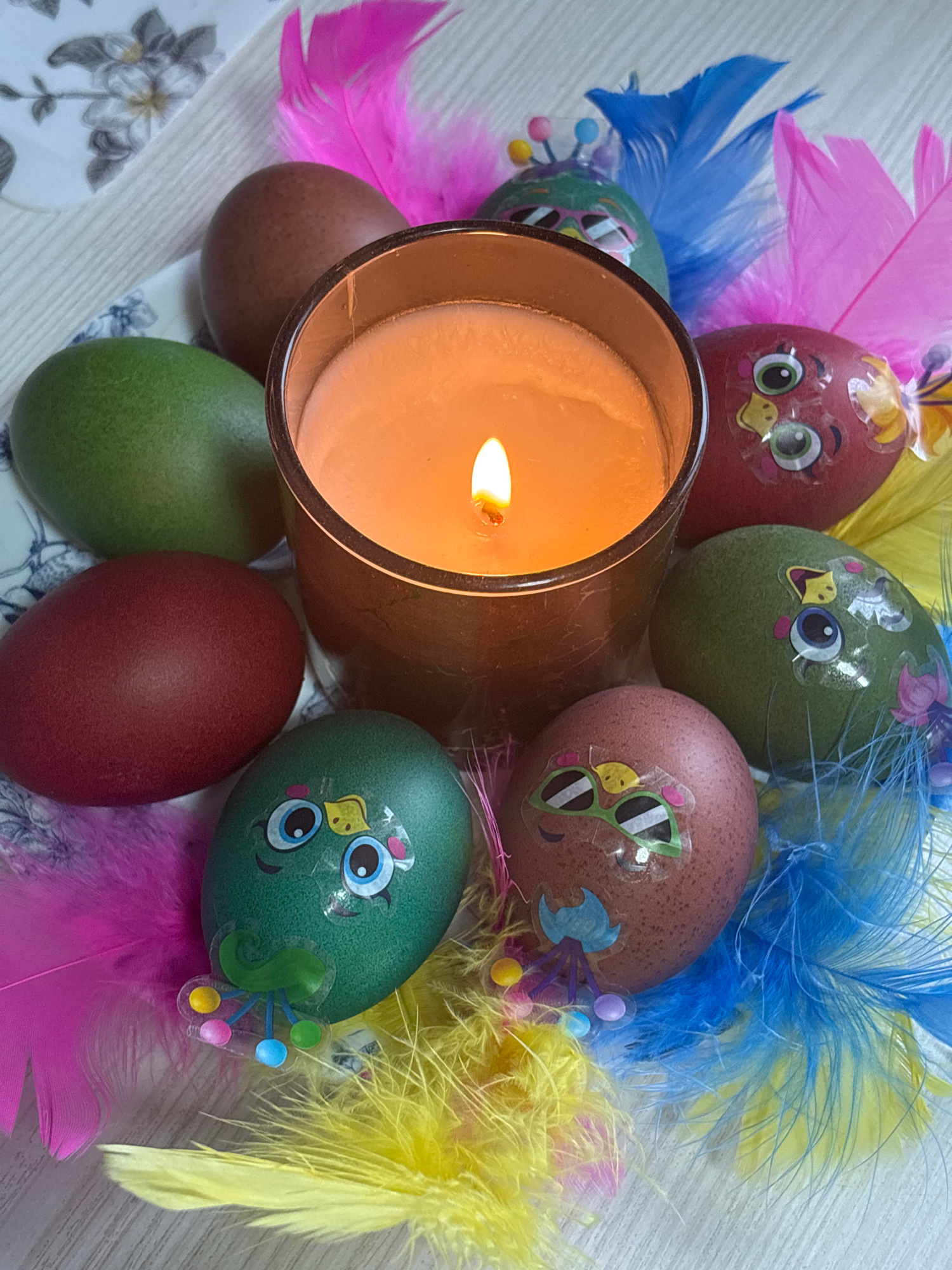 The image shows a lit candle in a gold-colored glass holder surrounded by decorated Easter eggs and colorful feathers. The eggs are various colors, including brown, green, and red, and feature cartoon…read more