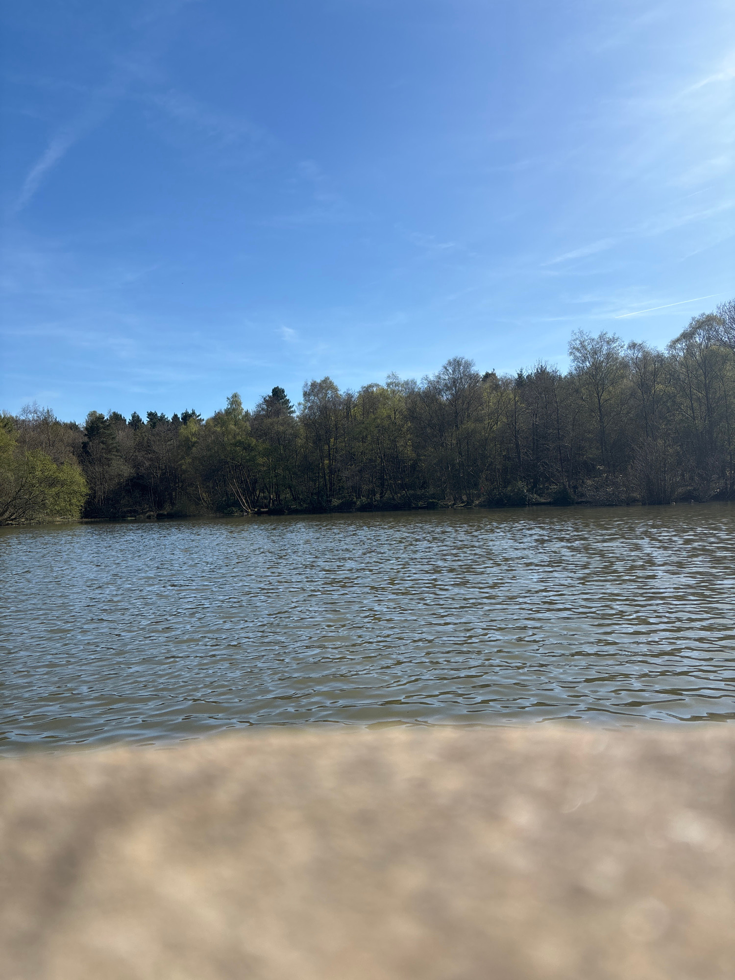 A landscape photograph shows a body of water bordered by a forest and a clear blue sky. The body of water appears calm with gentle ripples. The forest along the edge of the water is dense with trees.…read more