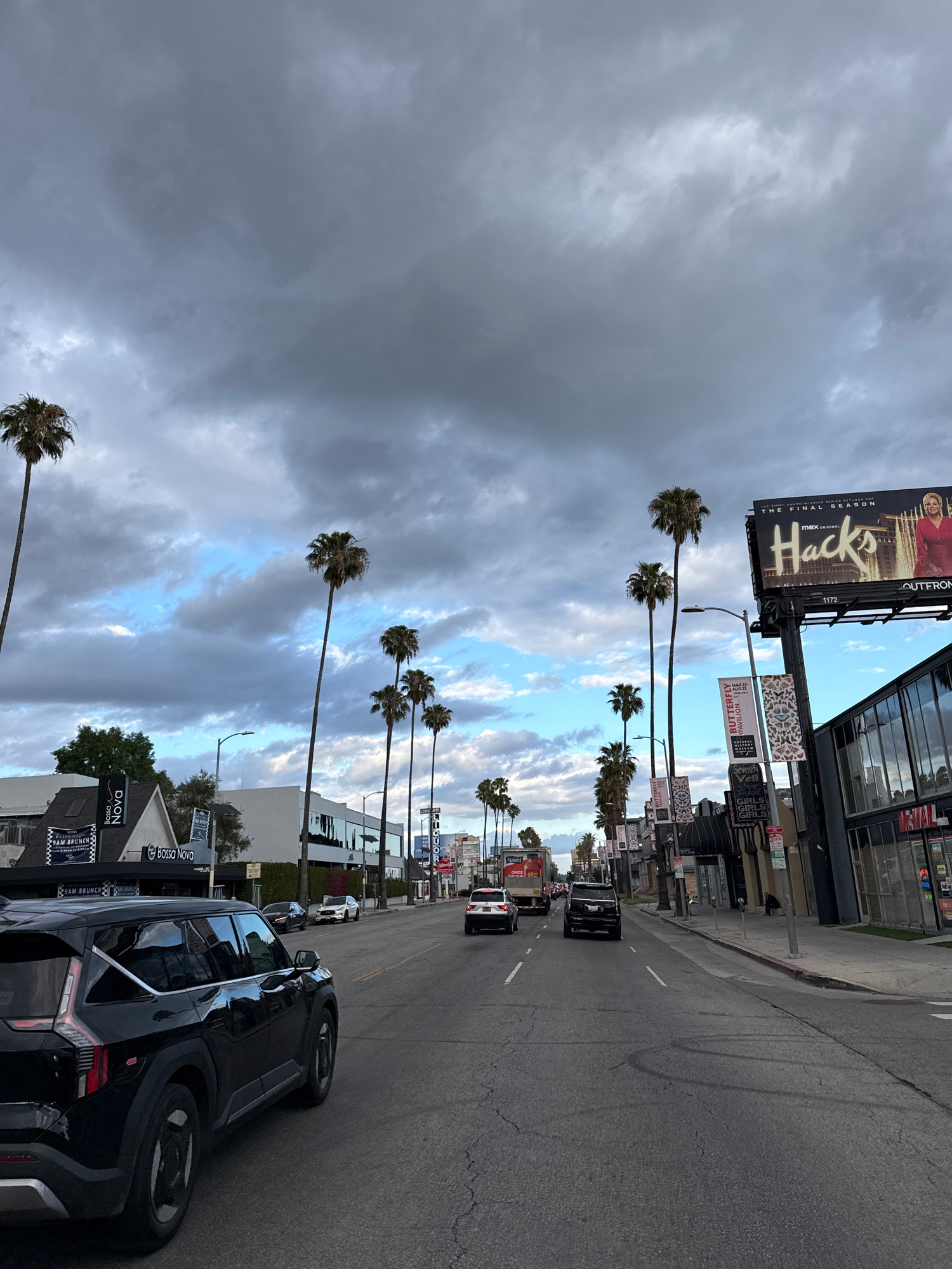 The image captures a street scene in Los Angeles, United States of America, with palm trees lining the road under a cloudy sky. A prominent billboard advertises the final season of "Hacks." Several ve…read more