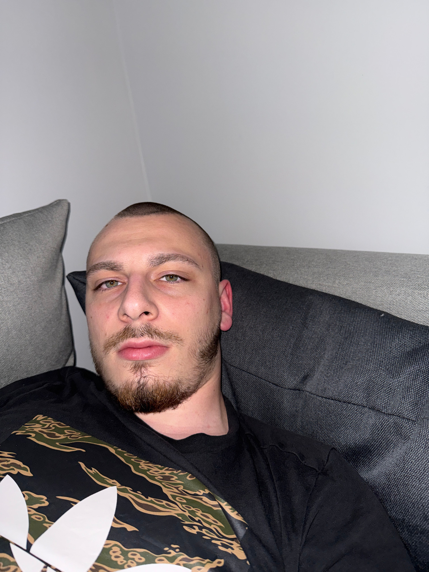 A medium, close-up, portrait-oriented shot depicts a light-skinned male with a shaved head and a trimmed beard, reclining on a gray upholstered surface, possibly a sofa or couch. He is wearing a black…read more