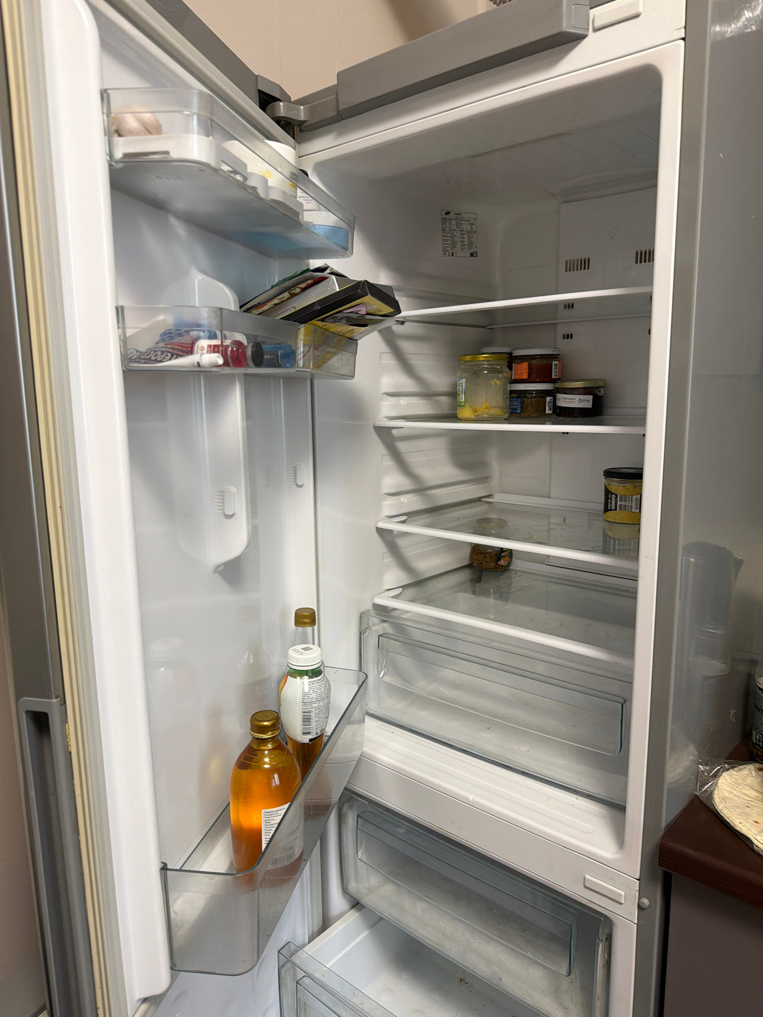 The image shows the interior of a refrigerator. The refrigerator appears to be mostly empty, containing jars and bottles. There are two bottles in a rack, one with a clear liquid and the other with an…read more