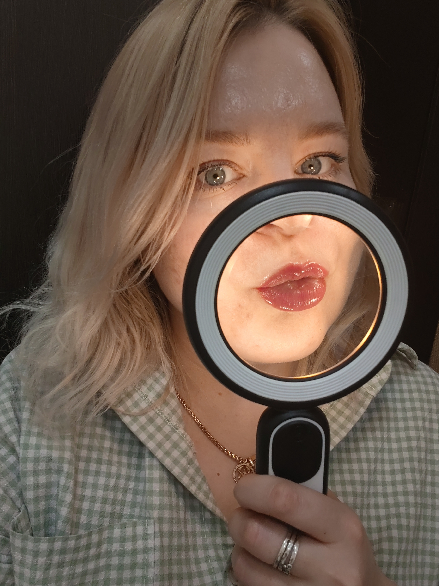 A woman with blonde wavy hair and blue eyes is holding a ring light up to her face, focusing the light on her glossy lips. She is wearing a green and white checkered shirt, and a gold chain necklace.…read more