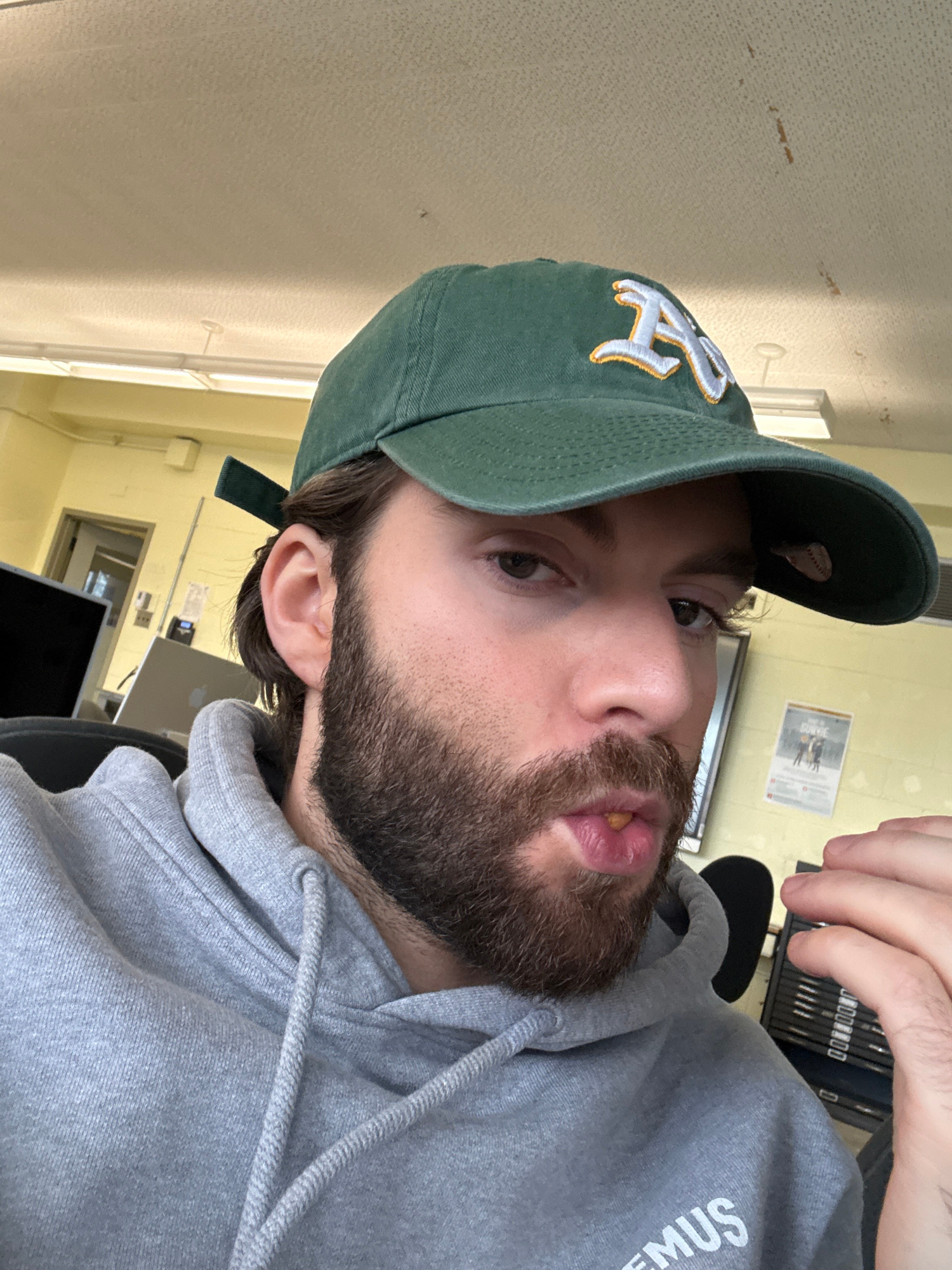 A man with a beard and a green baseball cap is indoors, wearing a grey hooded sweatshirt. The cap has a white "A" with gold trim. He is in a room that appears to be a classroom or office, judging by t…read more