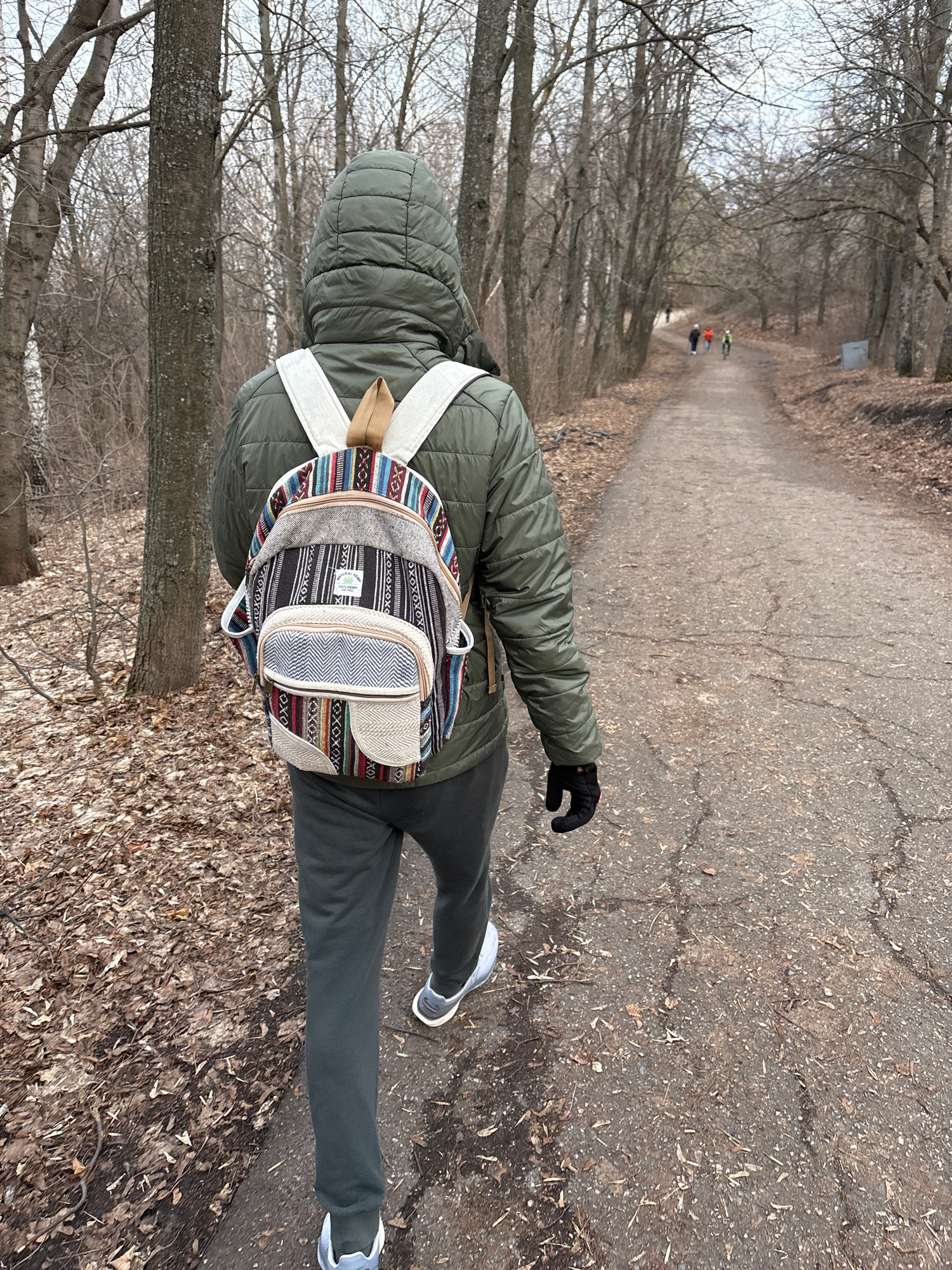 The image depicts a person standing on a path in a park-like setting. The person is wearing a green quilted jacket, dark green pants, and white and gray sneakers. They also have a patterned backpack o…read more