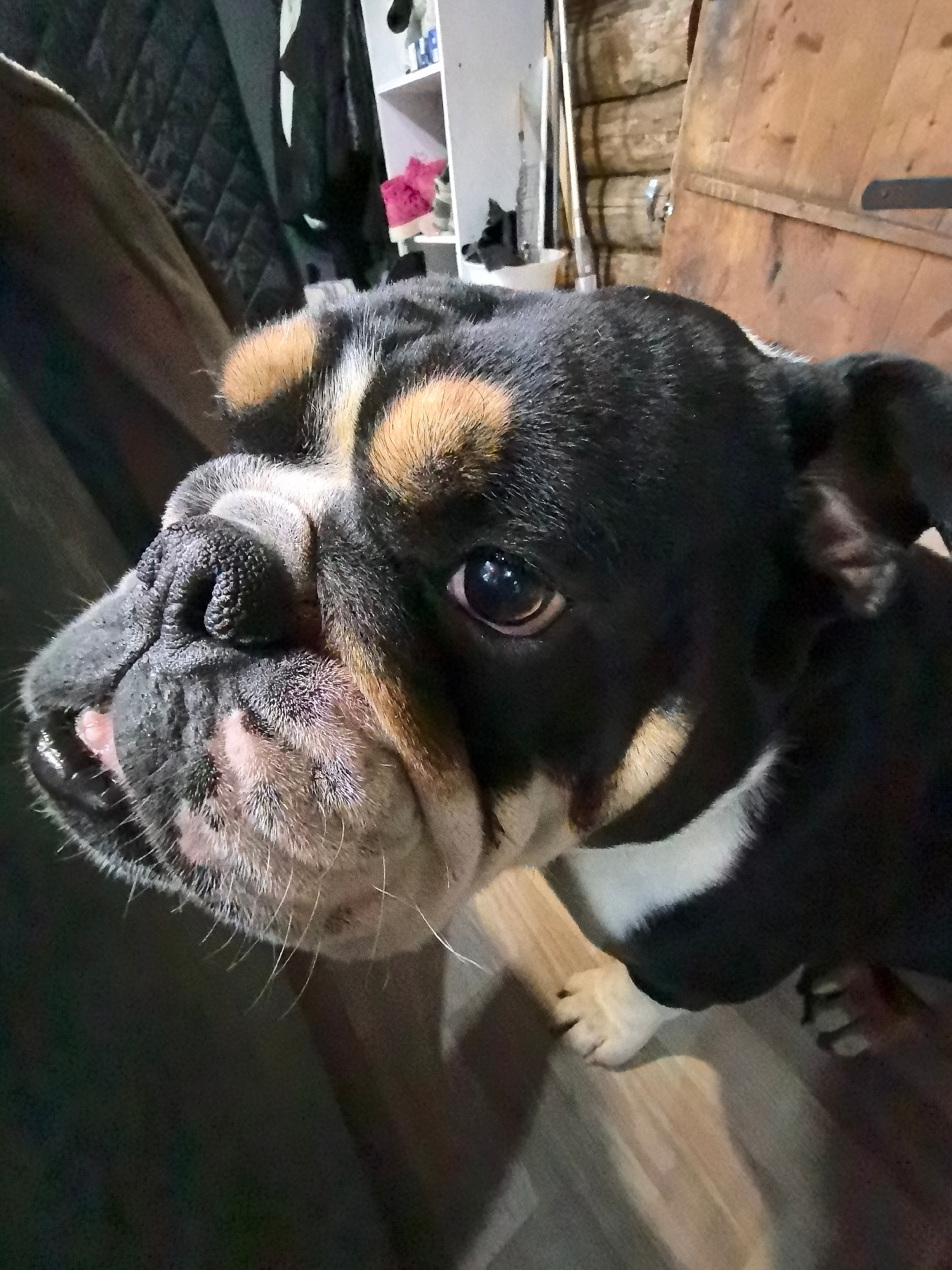 A close-up, high-angle shot features an adorable bulldog, likely an English or French Bulldog mix, with a distinctive black, tan, and white coat. The dog's face, characterized by wrinkles, takes up th…read more