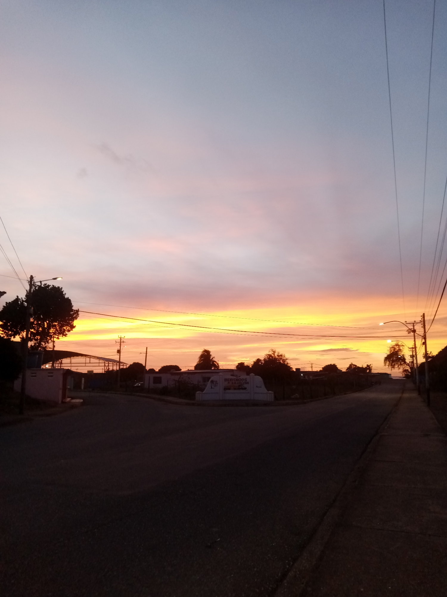 The image depicts a street in Juan Griego, Venezuela, at sunset. The sky transitions from yellow to pink to light blue. Power lines run along both sides of the street. On the left, there is a building…read more