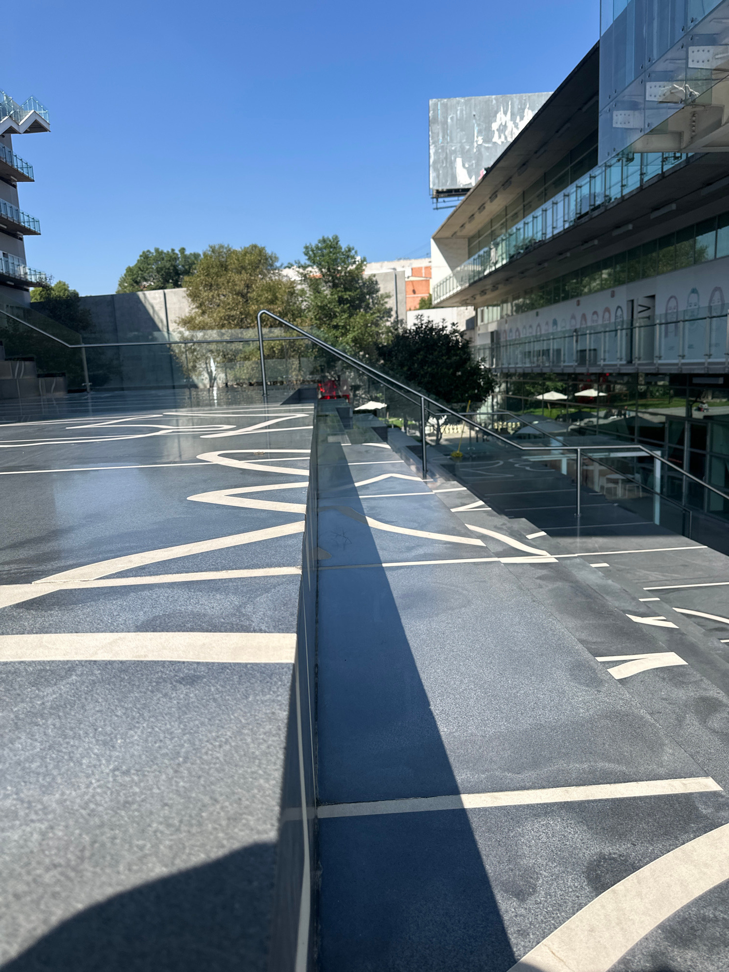 The image captures a downward view of a modern staircase situated outdoors in Mexico City, Mexico. The stairs are constructed from a dark gray material, adorned with a zigzagging pattern of thick, whi…read more