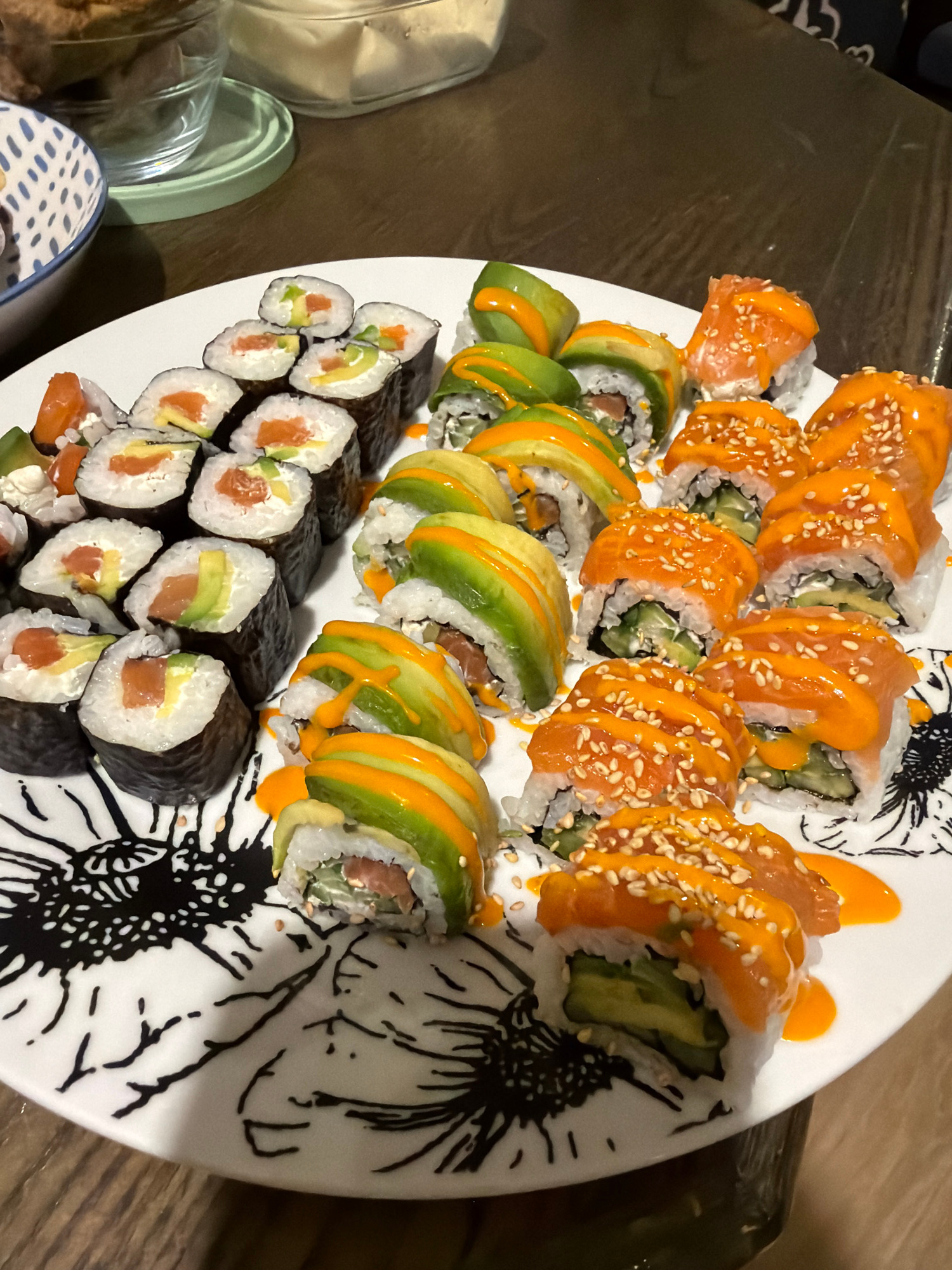 A top-down view shows a white plate with a floral design containing three rows of sushi rolls. The top row features sushi rolls topped with salmon, orange sauce, and sesame seeds. The middle row consi…read more
