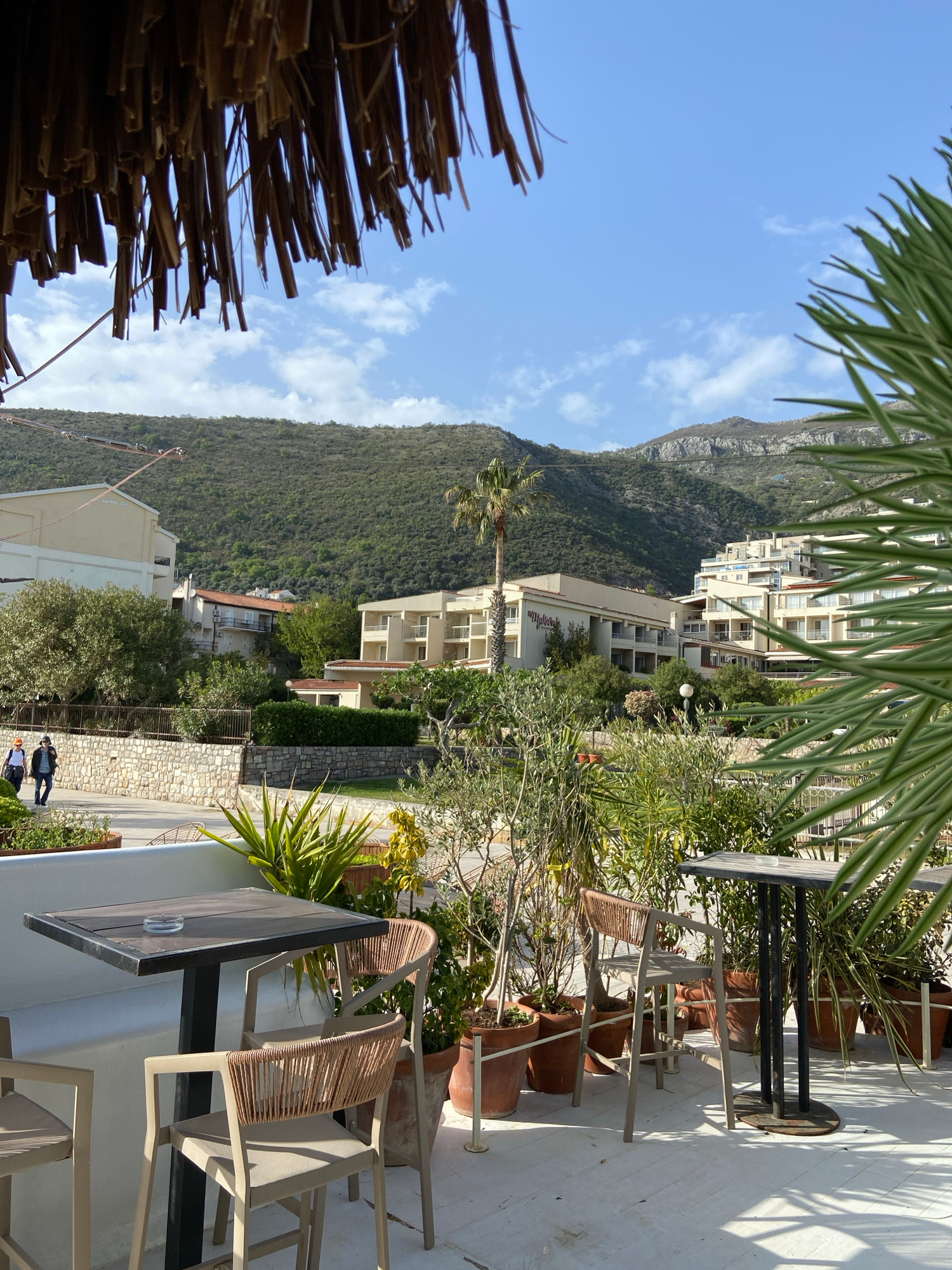 The image shows an outdoor patio setting in Petrovac centar, Montenegro. There are tables and chairs arranged on a white patio surface, with potted plants adding greenery. In the background, a mountai…read more