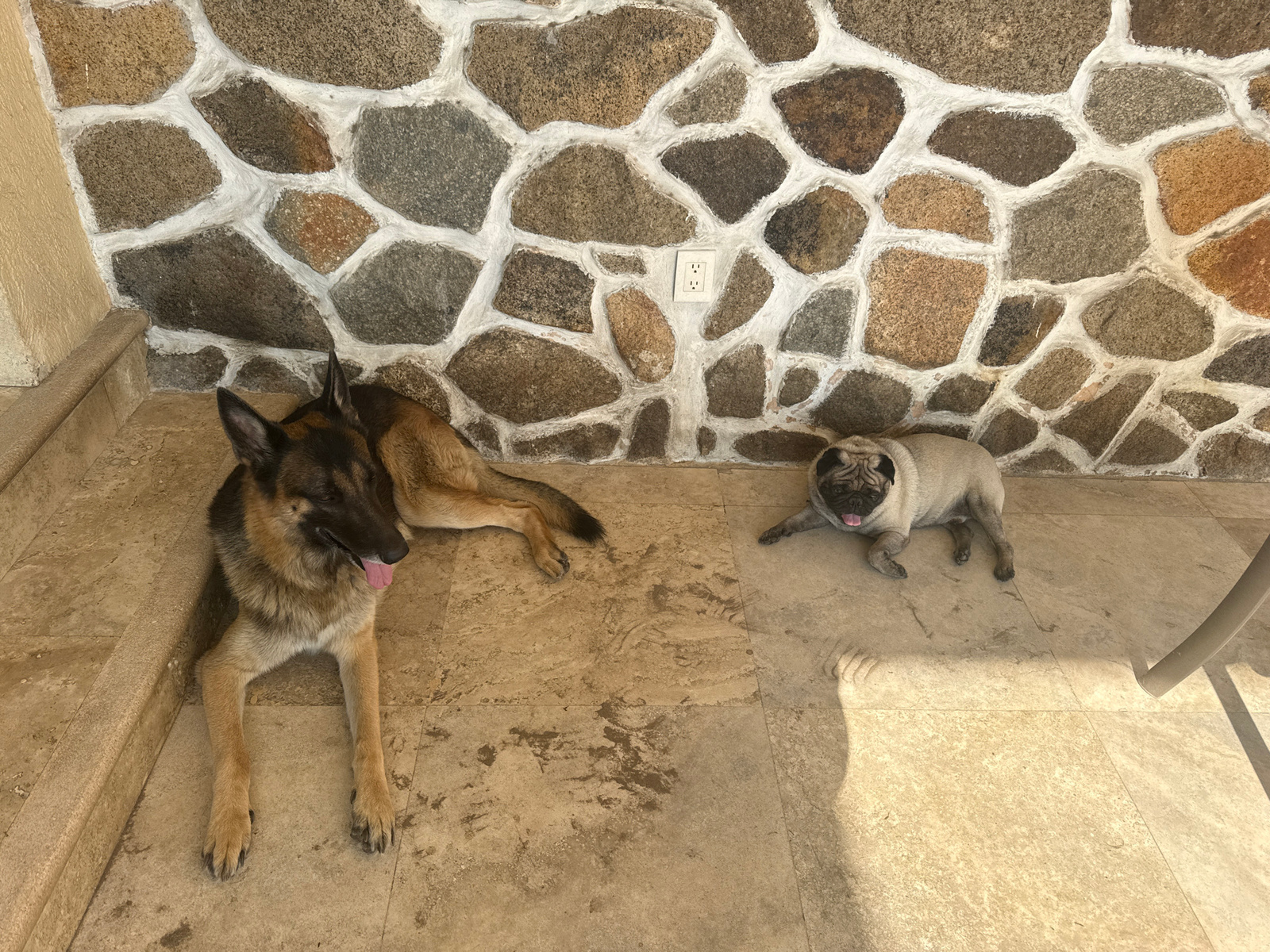 A medium shot features two dogs in what appears to be an outdoor area, likely a patio or terrace, with a stone wall behind them. The larger dog, a German Shepherd, is lying on the left side of the fra…read more