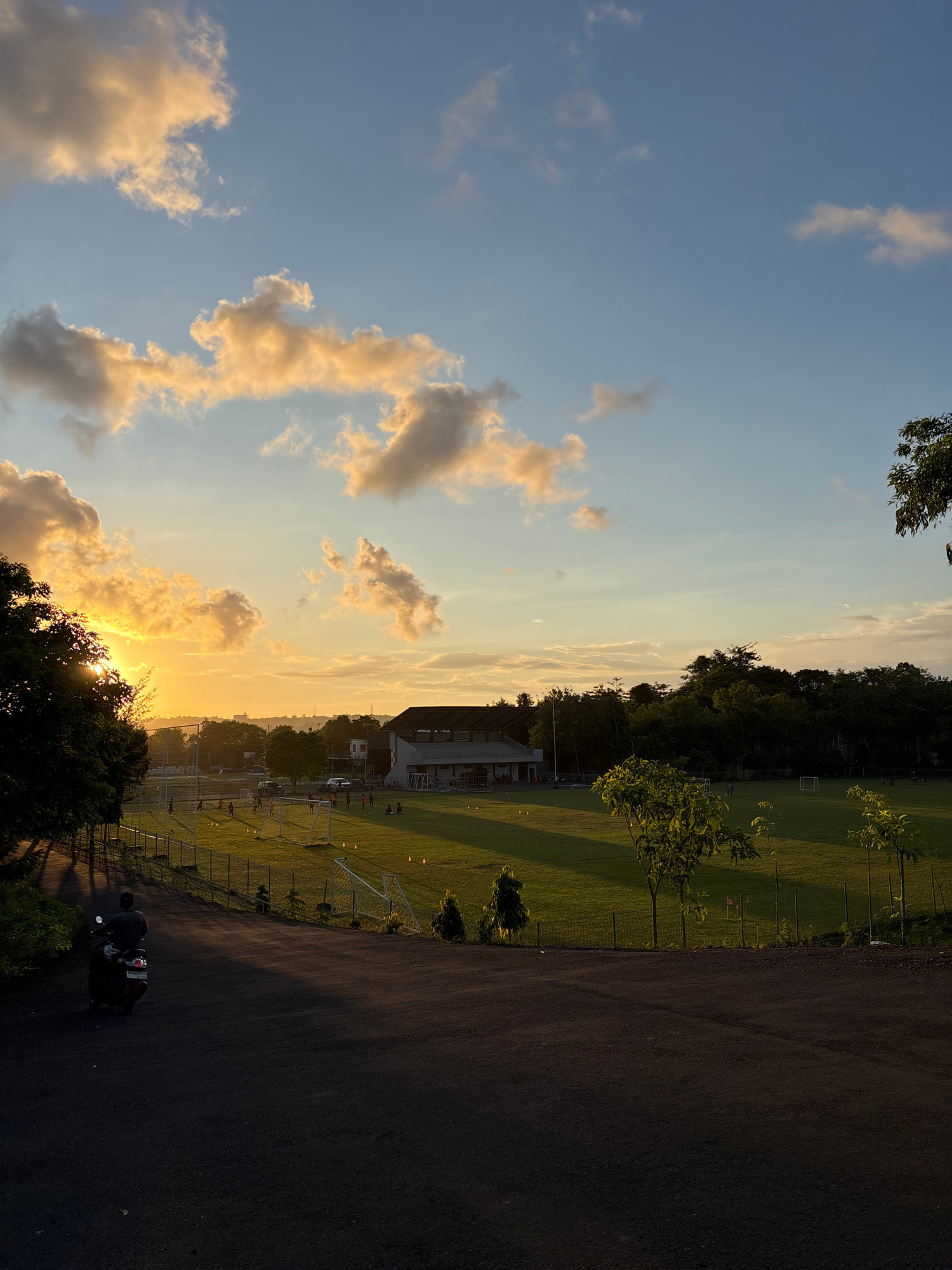 The image depicts a scene at dusk in Kuta Selatan, Indonesia. The sky is visible with hues of blue, yellow, and orange, punctuated by clouds. A sports field is adjacent to a road, bordered by a fence.…read more