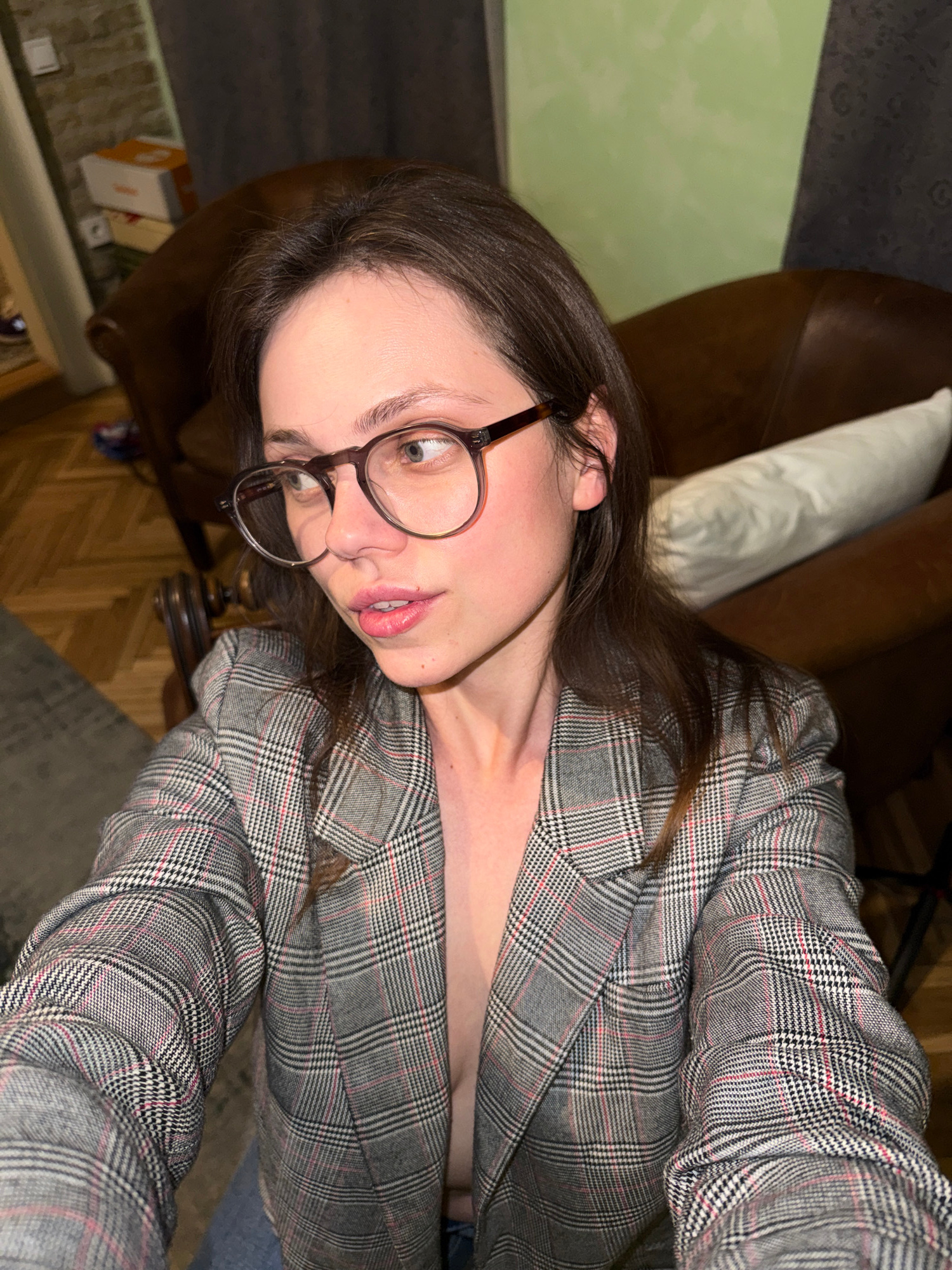 A woman is depicted in a selfie. She has brown hair and is wearing glasses and a gray plaid blazer. The background includes a brown leather chair with a white pillow and a wooden floor. There is alsoβ¦read more
