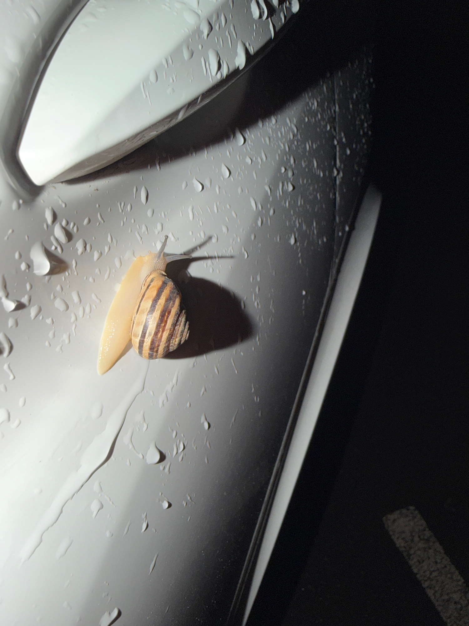 A terrestrial snail is observed moving across a wet, glossy white automotive surface at night in Chirpan, Bulgaria. The snail features a pale cream-colored foot extending leftward from its shell, whicβ¦read more