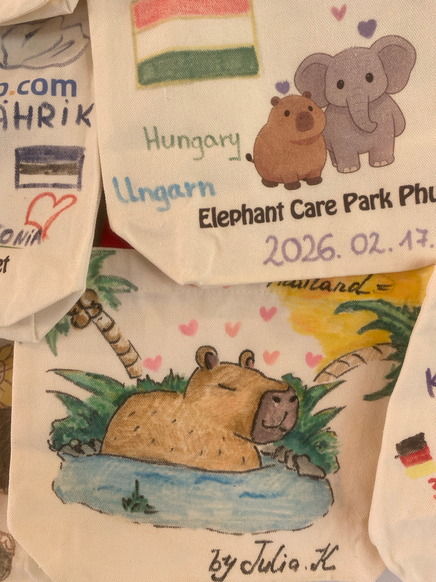 The image presents a close-up view of several overlapping small, white fabric items, likely personalized pouches or sachets, adorned with whimsical drawings and text. The texture of the fabric is visi…read more