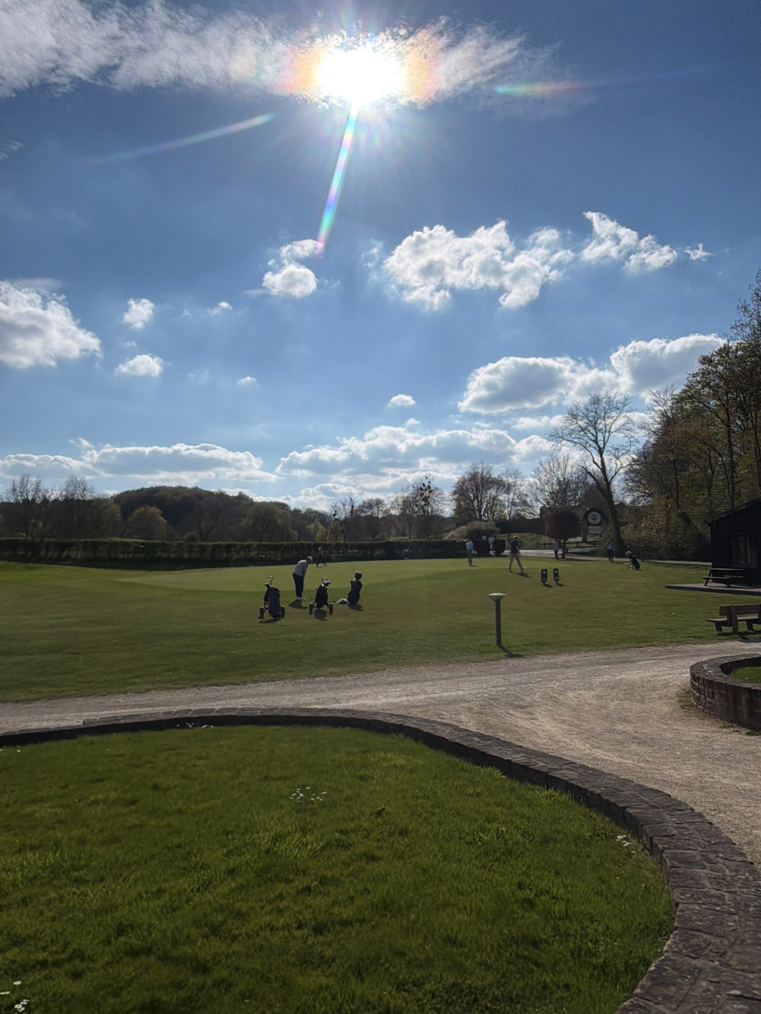 The image captures a lawn bowling scene in the city of Lenningen, Luxembourg, during daylight hours. A group of four individuals are actively participating in a lawn bowling game on a meticulously mai…read more