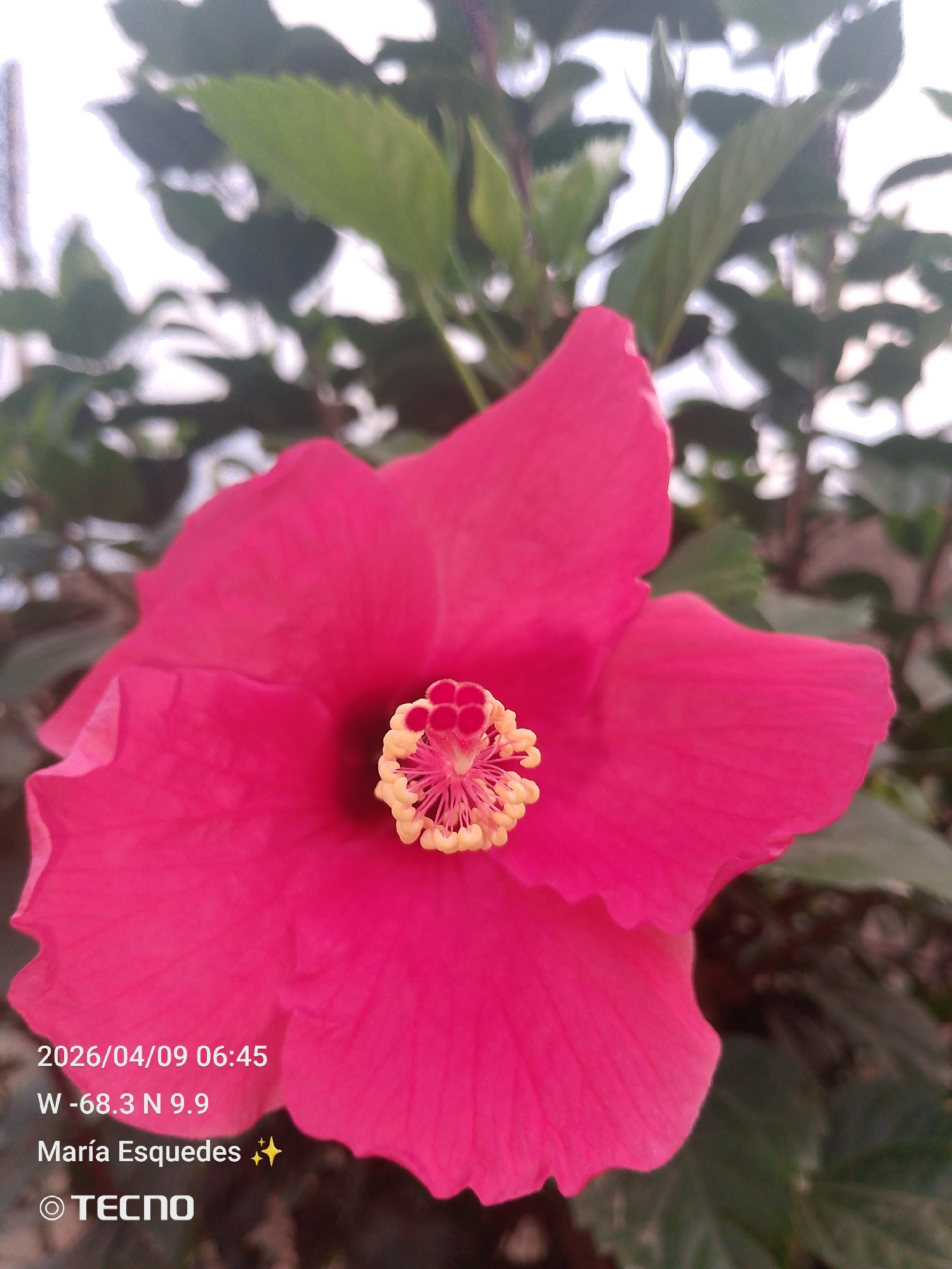 A close-up photograph shows a vibrant red hibiscus flower in full bloom, with its yellow and red reproductive structures prominently displayed at the center. The flower is surrounded by green leaves,…read more
