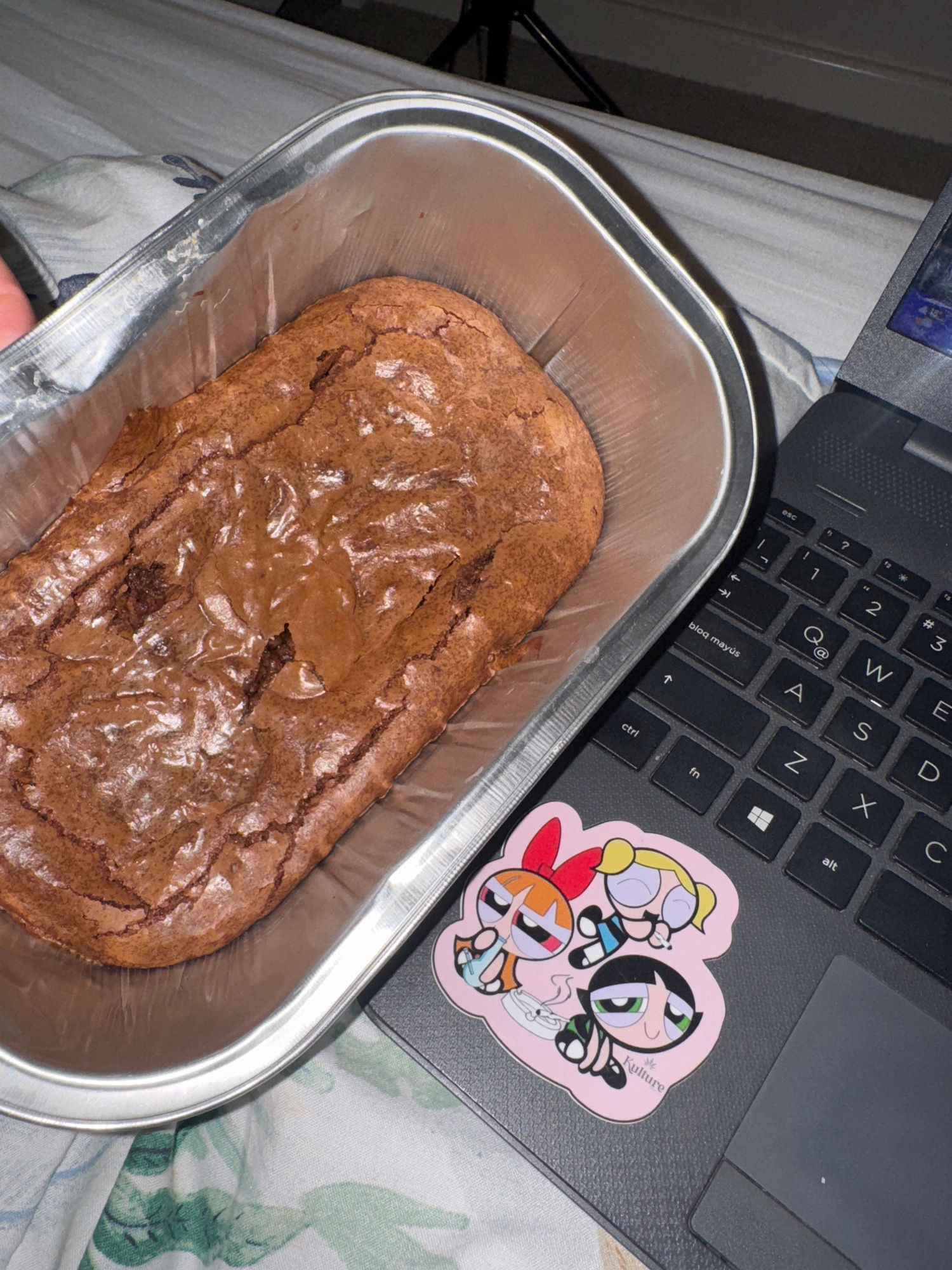 An overhead indoor shot captures a freshly baked brownie in a rectangular aluminum foil pan, placed on a soft surface, likely a bed, in Como, Australia. The brownie features a rich brown color with a…read more