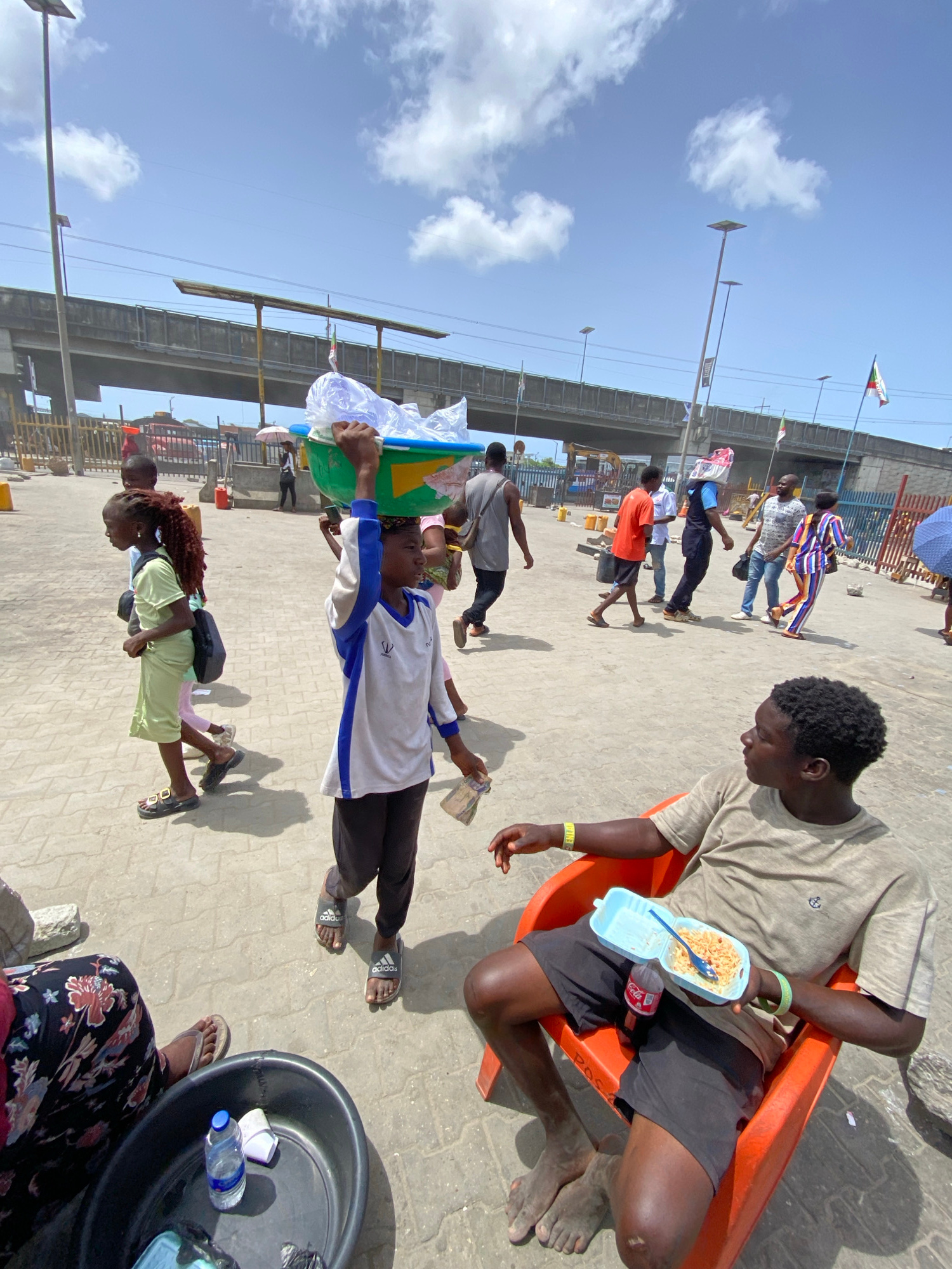 The photograph captures a street scene in Lekki, Nigeria. The setting appears to be outdoors, with a clear sky and clouds visible. Several individuals are present: * A man is sitting on an orange p…read more