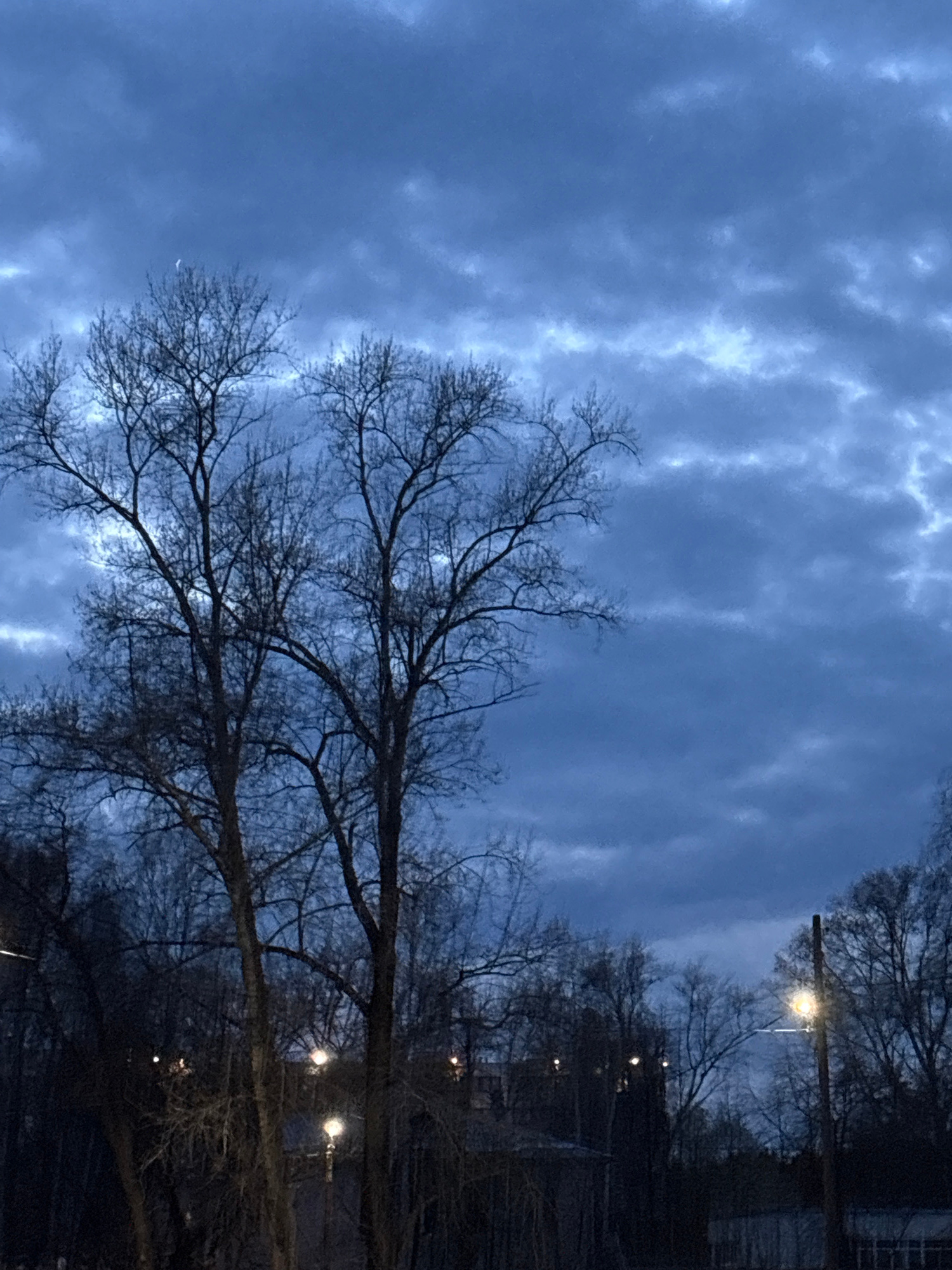 The image depicts a night scene in what appears to be a park or urban area in Chaikovsky, Russia. The sky is filled with a dark, cloudy, textured sky. Bare trees are silhouetted against the sky, their…read more