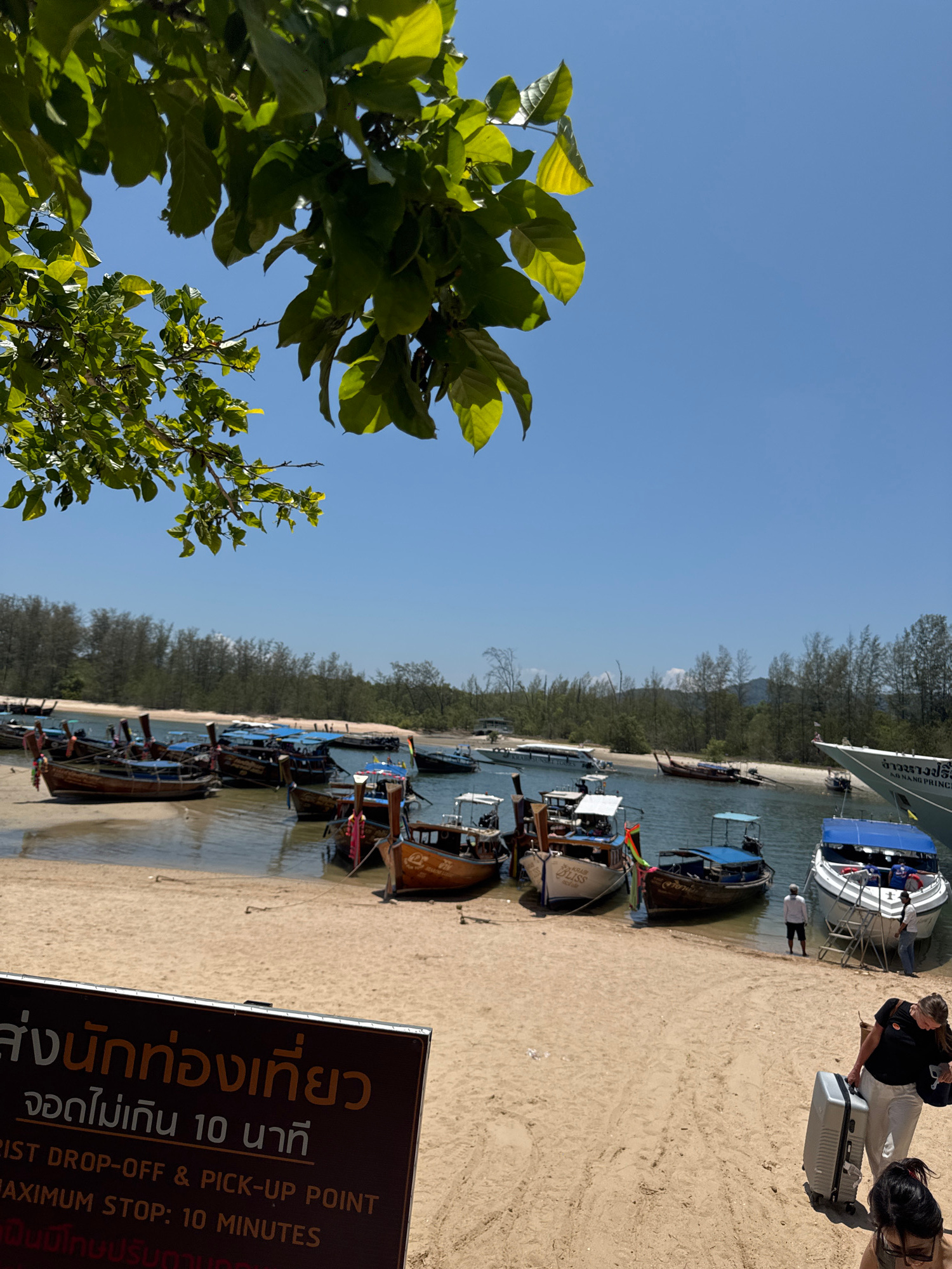 The image depicts a beach scene in Ban Klong Haeng, Thailand. Several longtail boats are moored along the shoreline. A sign in both Thai and English indicates a designated drop-off and pick-up point f…read more